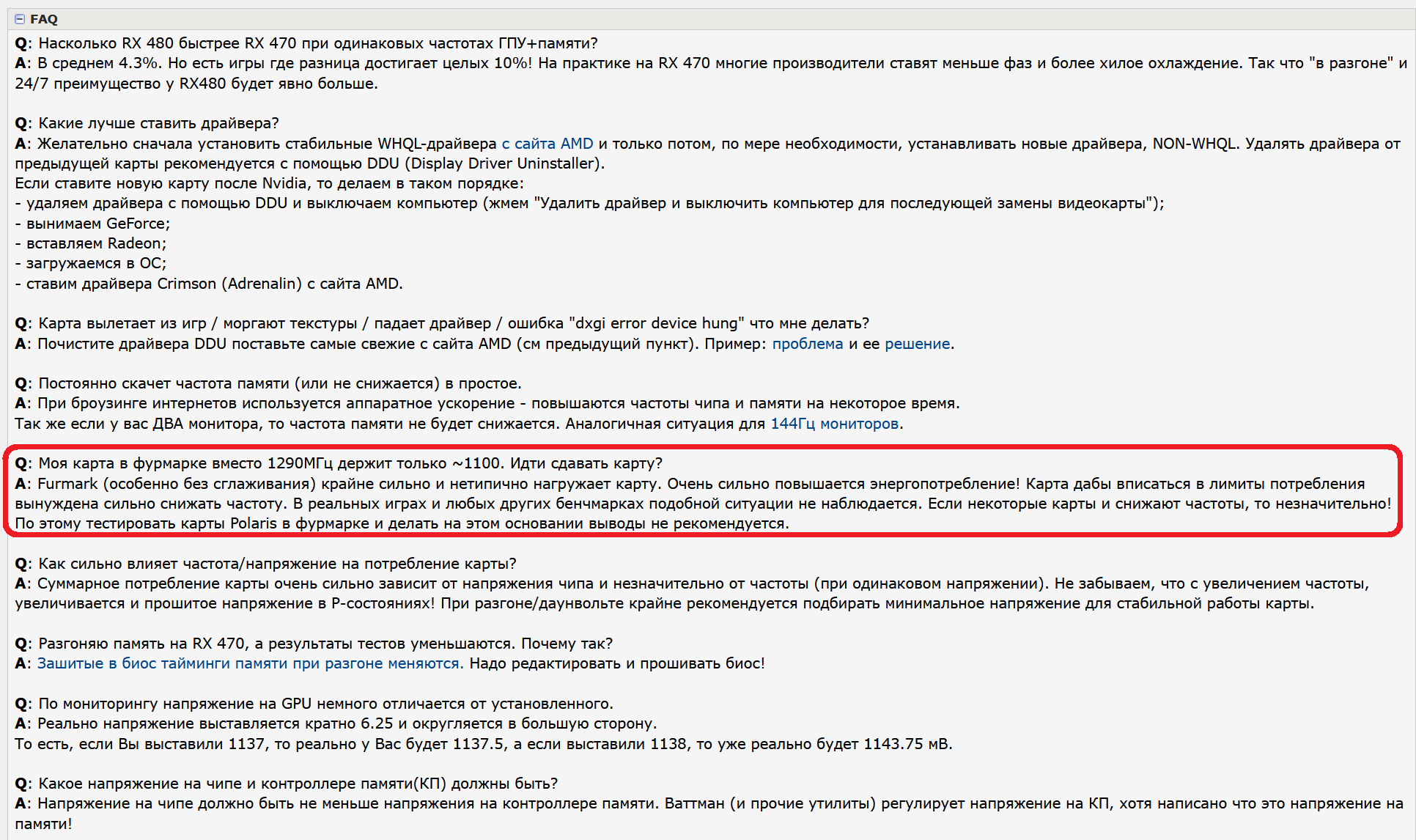 Q: Моя карта в фурмарке вместо 1290МГц держит только ~1100. Идти сдавать карту? A: Furmark (особенно без сглаживания) крайне сильно и нетипично нагружает карту. Очень сильно повышается энергопотребление! Карта дабы вписаться в лимиты потребления вынуждена сильно снижать частоту. В реальных играх и любых других бенчмарках подобной ситуации не наблюдается. Если некоторые карты и снижают частоты, то незначительно! По этому тестировать карты Polaris в фурмарке и делать на этом основании выводы не рекомендуется.