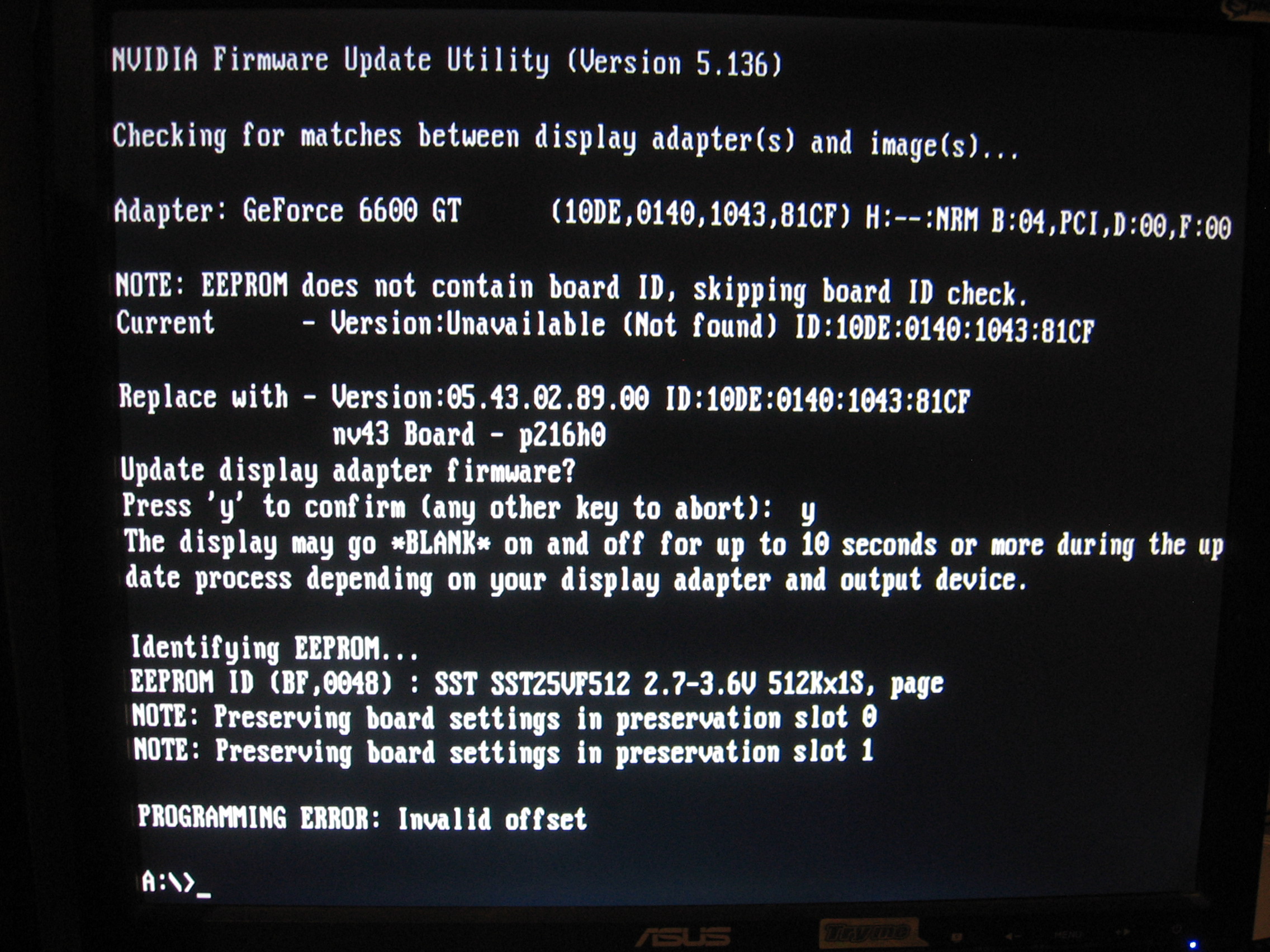 Bios, установленый в данный момент на карте, не идентифицируется, от сюда думаю и все проблемы. Видно чьи-то шаловливые ручки пытались перепрошить карту и зашили что то не то, в хлам карту не убили, но тяжко ранили. Правильный Bios зашить не получается, error на скрине выше... Как решить проблему, кто то в курсе?