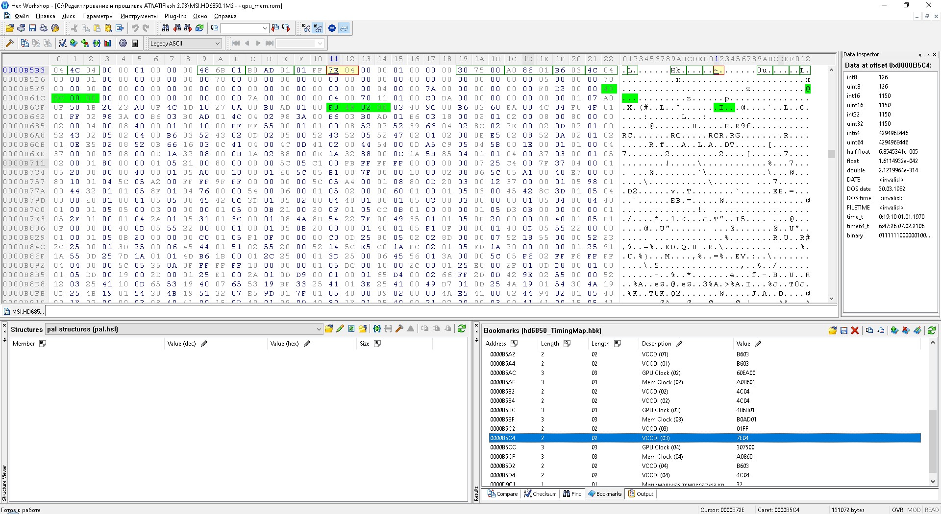 Продолжил исследования BIOS от MSI HD6850, выяснил что RBE изменяет сам код BIOS, где то кусок вырезает, где то вставляет, и получается каша. Решил править строго через HEX редактор (только чек сумму правил прогой AMDVBIOSChecksumTool. Выяснил, где находятся частоты, напряжения ядра и контроллера памяти (они прописываются отдельно друг от друга). Нашел две неприятных особенности : 1. Если изменить напряжение GPU Clock Info 03 (через RBE или HEX редактор, неважно), после заливки VBIOS в карту частоты в 3D не поднимаются вообще, стоят на самой нижней отметке, и карта тормозит даже при просмотре фильмов. Причем напругу контроллера пямяти изменять можно, она не зависит от напруги ядра, что еще больше расстраивает . Пришлось оставить ядро как есть, поднять только VMEM(VCCDI - я так назвал, удобнее, по аналогии с RX580 сериями карт) 2. Родные тайминги от Clock Info 04 (UMD) сыпали ошибками (и ошибки сыпались именно при просмотре видео, в играх все нормально), пришлось подбирать от других карт, подошли от XFX R9 280X 3GB, ошибки исчезли Вот что получилось