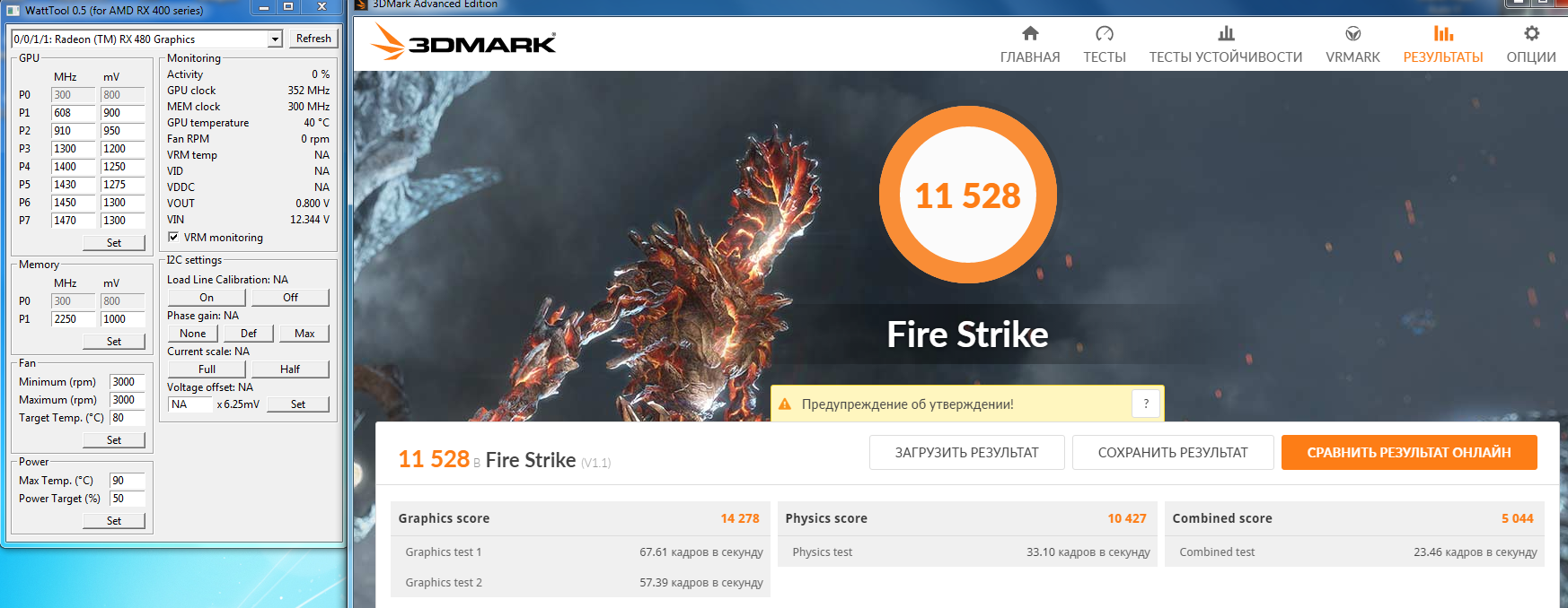 вышла MSI AB Beta 14 с поддержкой Polaris 10, тут я подумал, что выжму из ASUS Radeon RX 480 STRIX все соки (ждет она своего хозяина пока у меня), в прошлый раз из-за софта от асус и сапфир там было либо с вылетами, либо ограничение на 1400/2040, но здесь я думал оторвусь ... в msi ab оказалось напряжение можно повышать только на +100 мВ, что в итоге с офсетом получалось до 1.235 В, что меньше, чем через ту же gpu tweak ii, где шим позволял до 1.3 гнать. ладно думаю, есть прога WattTool-0.5, выставил там 1480 МГц по ядру при 1.3 В, 3DMark 2013 Fire Strike прошел, ура, гляжу результаты и обалдеваю один из первых прогонов при 1470 =