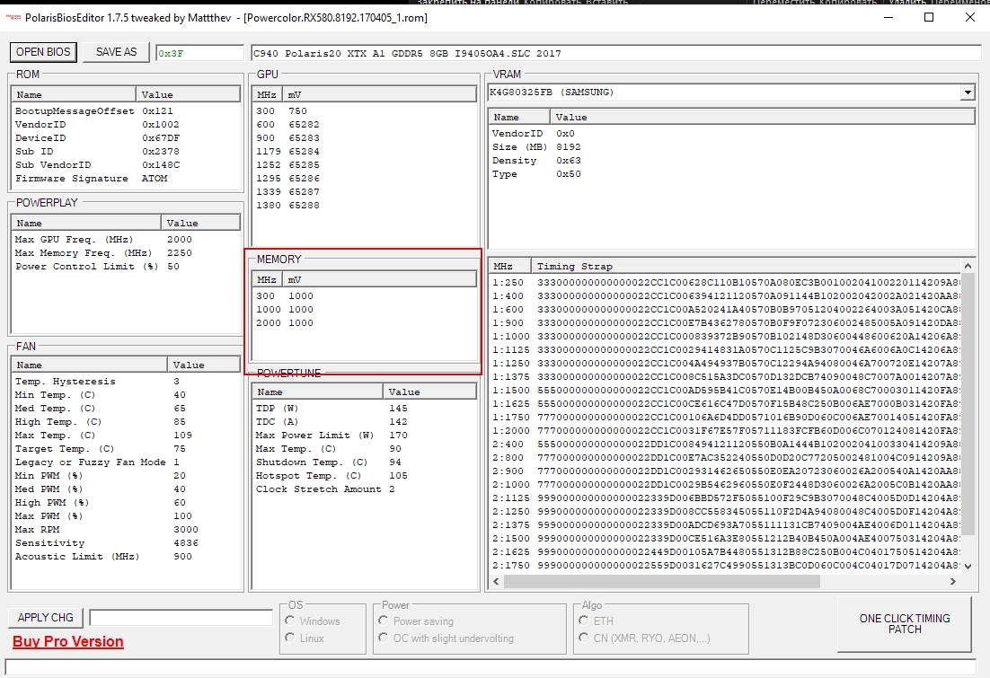 Здравствуйте. Есть карта asus strix 570 rx 4gb берет по памяти 2000 в бенче выдает 227gb, дальше не гонится, при повышении даже на 50, сыпяться ошибки. 2000 для эльпиды придел? Может у кого то есть свои страпы, с шапки все перепробовал. По ядру берет 1400 при 1.2, знаю много, но карта выше 75 не греется, поэтому пока оставил так.