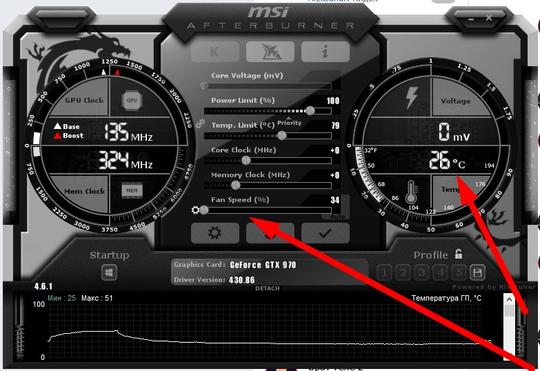 Следующий шаг, скачал MSI afterburner, установил видеокарту на место и начал тестировать. Запустил GTAV и приступил к мониторингу. Вентиляторы раскрутились до максимума уже на рабочем столе, так что после запуска - ситуация оставалась прежняя. Стоит отметить, что MSI afterburner , также как и AIDA64 не чувствует по каким-то причинам количество оборотов на видеокарте. В режиме авто - обороты, как и в AIDA64 - 30-45%, если выбрать ручной режим регулировки вентиляторов, то он просто не откликается, какую бы я скорость не выбирал - изменений нет. После 10-ти минутной игры, что имеем: - Максимальная температура 51 градус. - Как только я ставил игру на паузу, то бешеные вентиляторы ее охлаждали очень быстро до стоковой температуры. - По замерам скорость вентиляторов в норме, они вообще не меняют свое значение ни в плюс ни в минус. На режиме AUTO - 45%, а ручной никак не откликается.