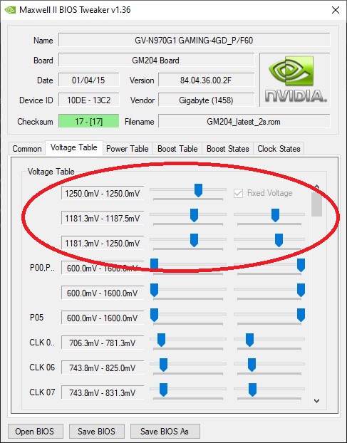 Информация от участника темы: Аффторитет Приведу пример как разгонять карты 970/980/980ti по таблице буст частот. Не буду писать как бекапить/сохранять биос, как и какие ставить поверлимиты - все это есть в шапке темы в инструкции по разгону. Образцом к материалу будет моя MSI GTX970 gamming 100ME. Поиграл я с разгоном в Afterburner-e и решил зашить разгон в биос. Задача разогнать карту бустом до 1506МГц при напруге в 1.231в. Начинаем.
