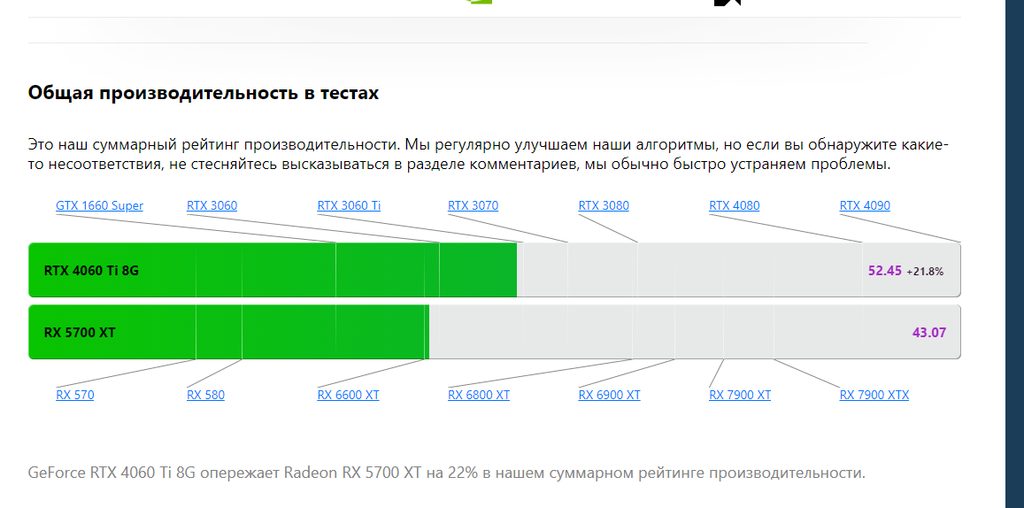 у вас в предудущем посте противоречие, цитатами я его выделил. я не понимаю как использовать этот сайт, вы уж простите, по той ссылке что вы привели берем 5700хт это полный аналог производительности 2060с и от него отталкиваемся. Может я конечно куда-то не туда смотрю. Но у меня как-то так. получается 30-22= 8% разницы с авторитетным и не очень по вашему мнению сайтом.