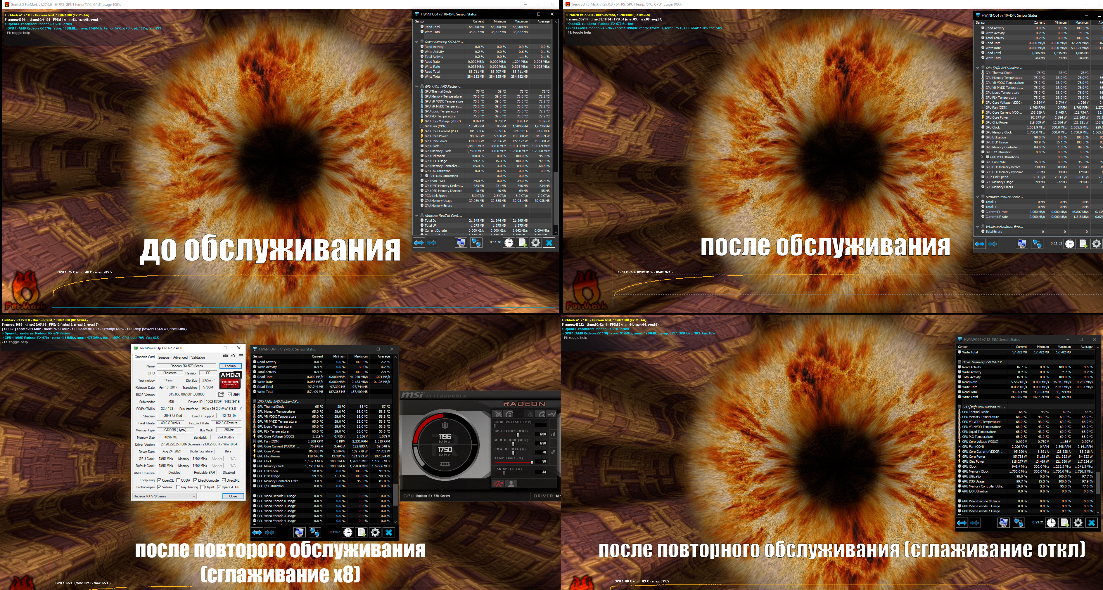 Пересобрал я карту, и вот какую странную картину получил. Первая фотография - это до всех процедур. Вторая после замены термопасты и термопрокладки. После обсулживания заметил, что видеокарта сильно раскручивается, а температура относительно небольшая - решил пересобрать карту. Пересобрал с заменой термопасты, закрутил винты крест-накрест, почти до упора, чтобы контакт с чипом был как можно выше - вот что получил: ядро выше 900 MHz не бустится, если поставить в фурмарке 8x MSAA сглаживание, то частота ядра становится в пределах нормы - 1900-2000 Mhz. Я не силен в таких тонкостях, запутался окончательно, надеюсь на вашу помощь, ребята
