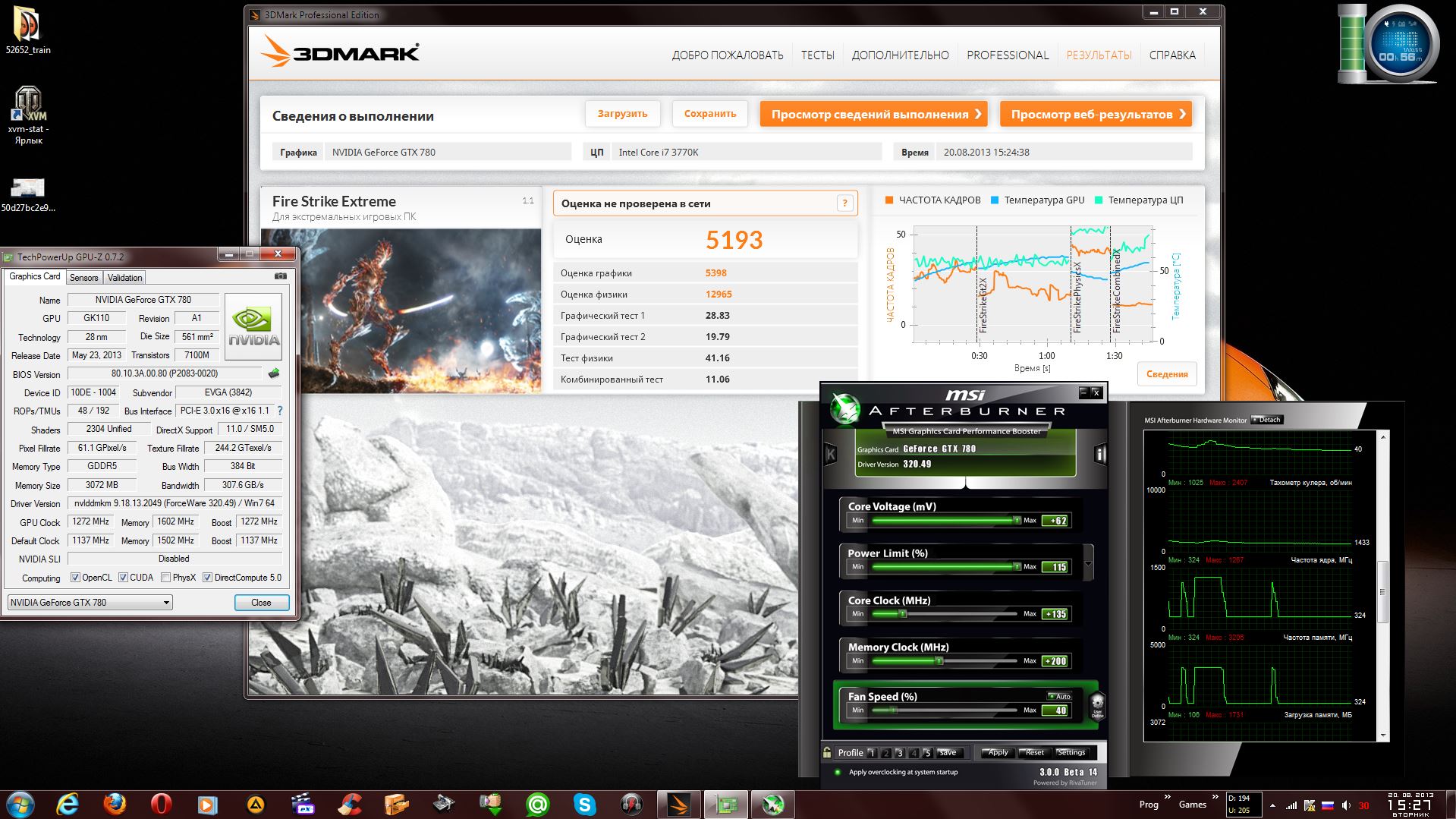 Все было с разгоном + 150 по ядру и + 500 по памяти!!! Память конечно вообще не понятно зачем разгонять)) что с ней что без показатели практически одинаковые) у меня максимум память до 7450 гналась, пока уже полоски зеленые на экране не появились)) по ядру максимум до +200 гонится!!! ставишь 207 и экран зависает)) но я считаю 150 - это стабильная норма!!! и больше не надо)) Поправочка одна, 3DMark11 там где 10007, ядра работали на +190!!!