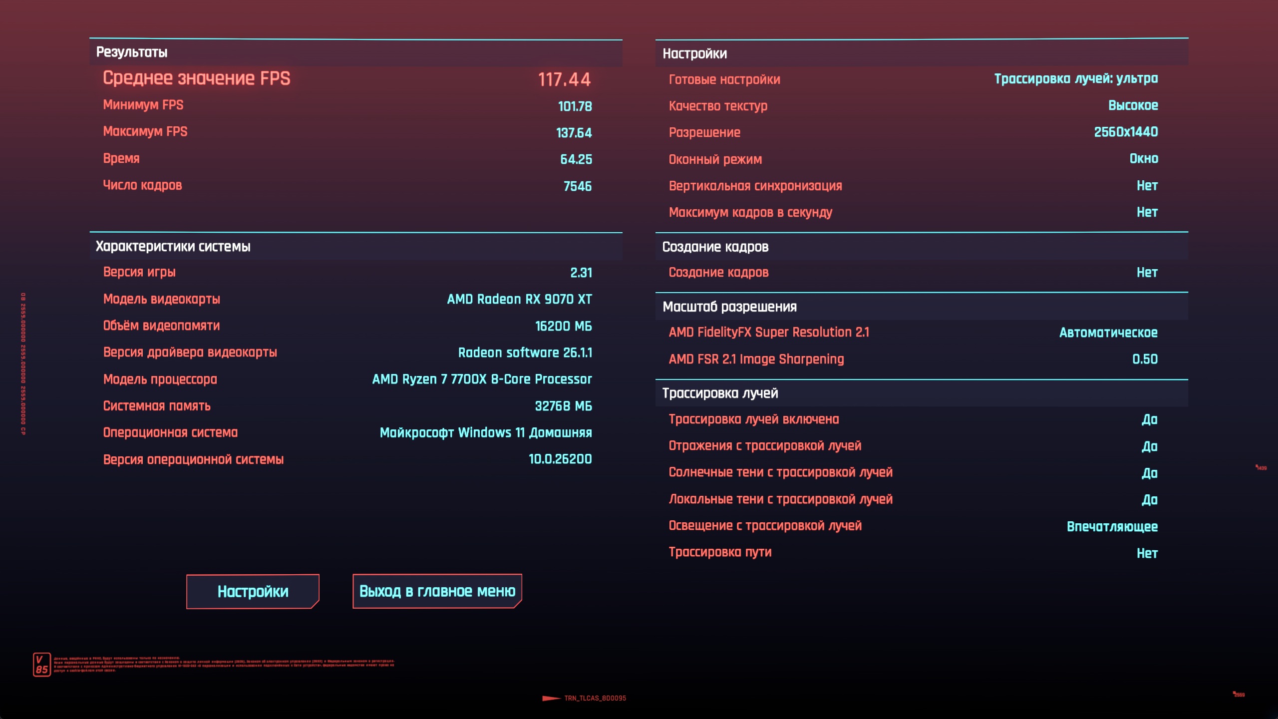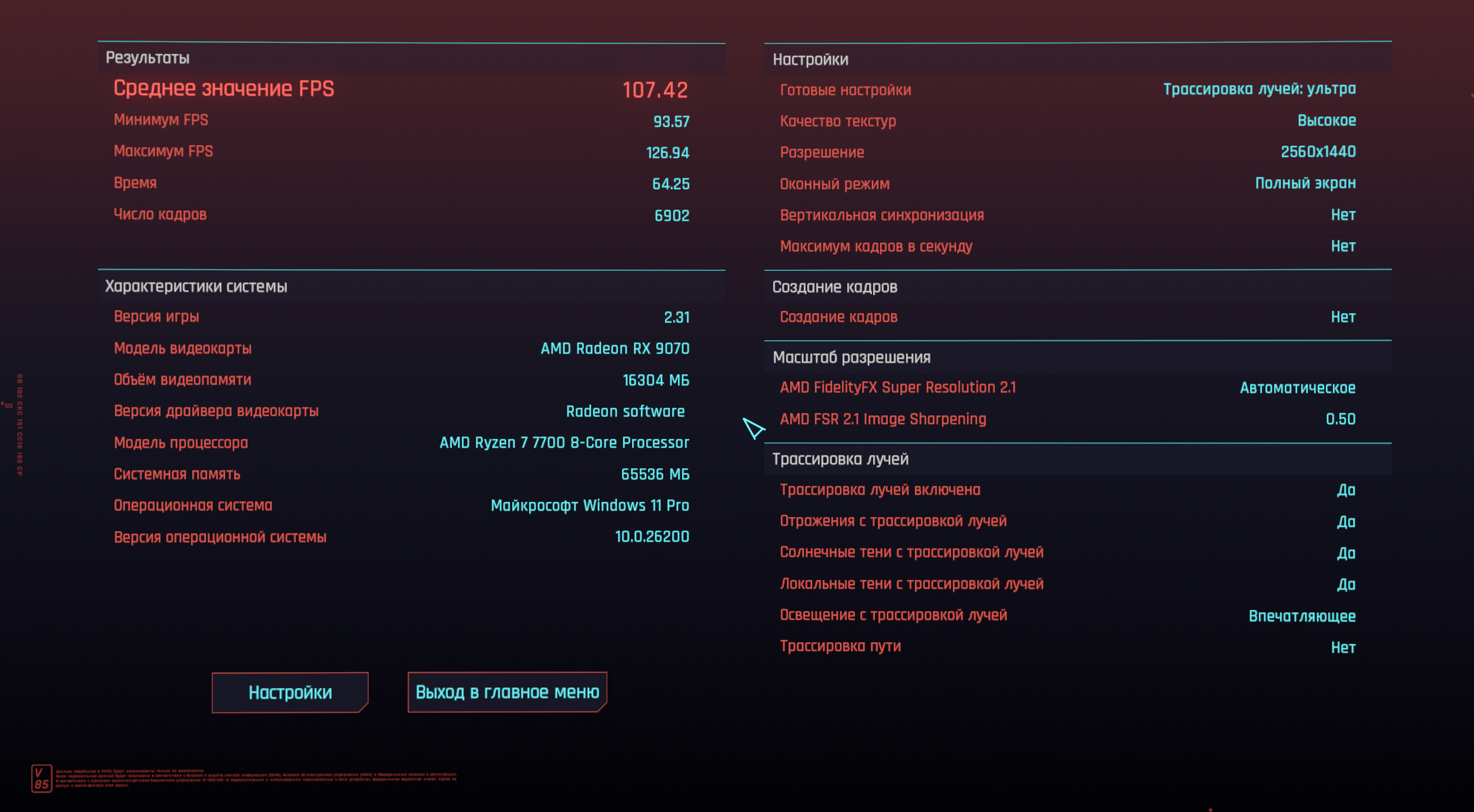 Поделитесь пожалуйста результатами теста 9070XT в Cyberpunk 2.3.1 версии вот с такими настройками, это мой скрин 9070 прошитой с лимитом 323w, заранее благодарю