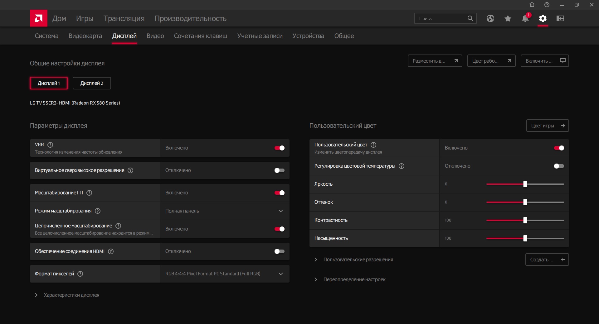 Добрый день! Пытаюсь подружить Монитор, телевизор и RX580. 1. Монитор работает в FHD, телевизор (LG C1) - 4К. Опытным путем выяснил, что при установке режима дисплеев - расширить дисплеи - телевизор работает на 30 Гц. Если выбрать только телевизор или дублирование изображения, то работает и на 60гц. При этом монитор всегда работает на 60Гц без всяких проблем. Есть ли возможность заставить оба дисплея работать в 60ГЦ всегда?
