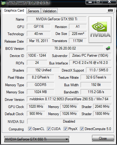 Все-таки для GTX 550 ti этот показатель должен быть 21,6 при 900 МГц по ядру. Так как Pixel fillrate рассчитывается как число растровых операций (ROP), помноженное на тактовую частоту (24*900=21600). А 7,2 должно быть при 300 МГц. Я подумал это от того, что карта сбрасывает частоты в простое, однако в нагрузке тоже самое показывает. К тому же при запуске GPU-Z карта приходит в режим боевой готовности, частота поднимается с 50 до 900 (фиксировалось мониторингом NVidiaInspector). Я возможно чего-то недопонял и вообще не стоило заморачиваться. Главное получил от карты то, чего и ожидал - отличная замена 8800 GTS.