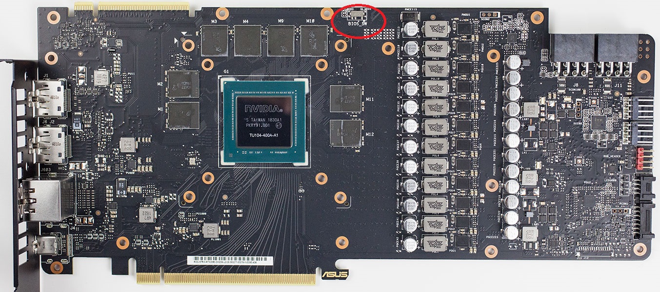 Есть на сайте владельцы карты ASUS ROG Strix GeForce RTX 2080 OC, что то не могу найти тумблер переключения BIOS на карте (P-BIOS и Q-BIOS), подскажите где он находится? кнопку вкл/выкл подсветки вижу.