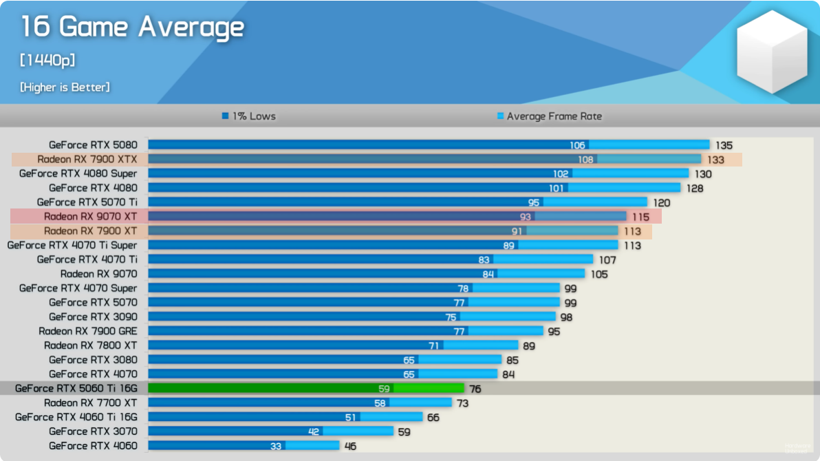 Да неужели? 7900XT и 9070XT, согласно "всем, кто уже давно сравнил", тоже примерно равны, а XTX примерно на 15-16% быстрее.