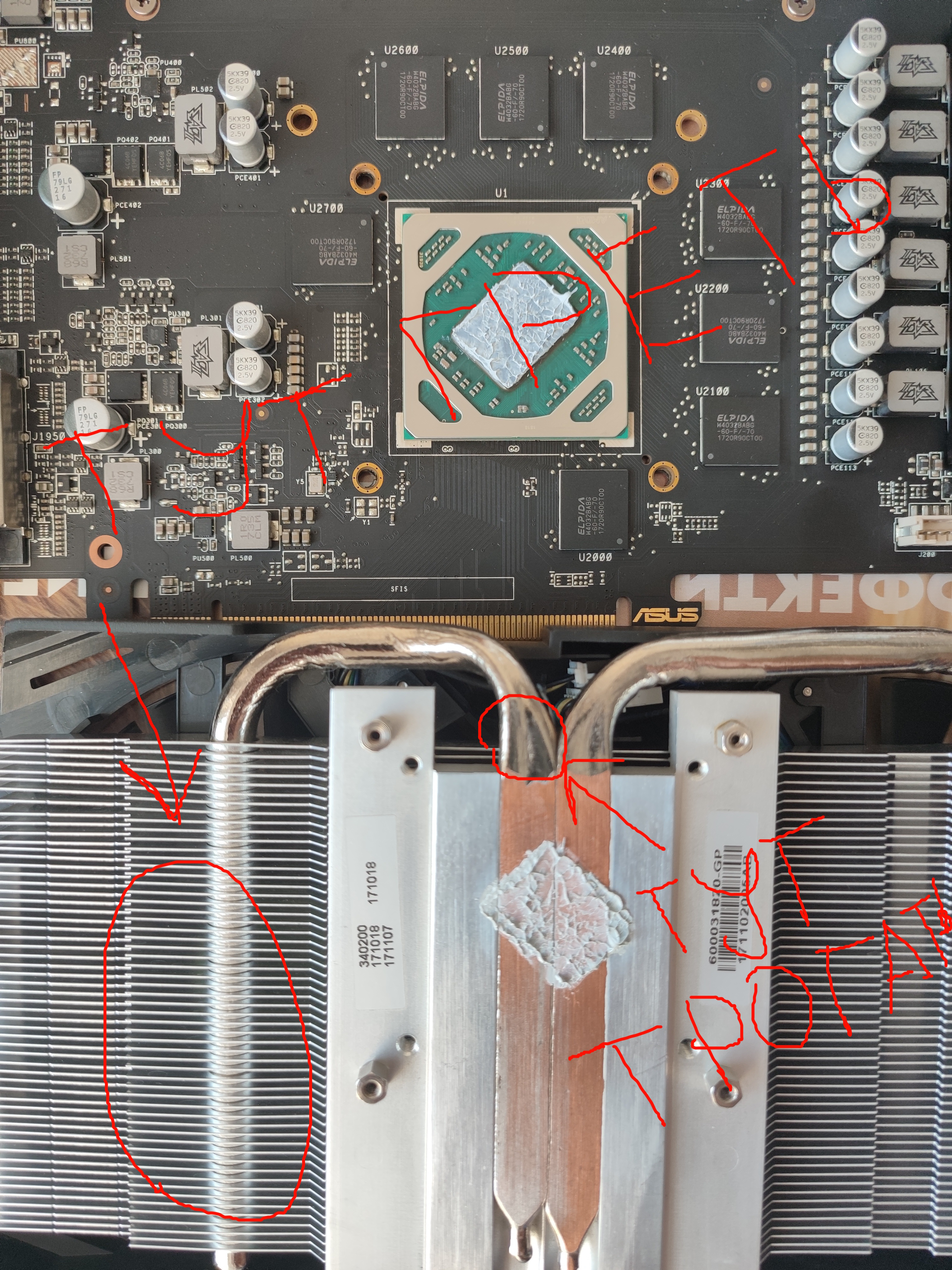 Охлад снимается для проверки, какие вы там элементы греть собрались вокруг? Не тестят охлад "проблемный" на горячую, во первых чип нефиг лишний раз греть(стоит объяснять чеммгрозит прогрев чипа от половины площади которого не отводится тепло?) а во вторых смысла нет, на этой карте например только если на райзере можно до трубки добраться во вкюченном сострянии, они внутрь там развернуты и никак вы не подлезите чтоб ее ощупать нормально и уверенно понять пробита она или не.. А что водой(если дома например) что феном паяльным(если на раб. месте) охлад проверяеися за 30 сек. без проблем и риска что то спалить, пробить статикой лазя руками в работающий комп и т.д. Ламерство это, еще и с таким пафосом транслируемое что рукалицо .