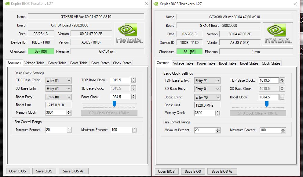 Народ, приветствую! Помогите разобраться. Имеется карта EVGA GXT770 SC. Скорее всего прошит модиф. БИОС, так как питание 1,2в. После прошивки родного напруга как и должна быть - 1,175.У предыдущего хозяина она проработала достаточно долго, так что думаю боятся 1,2 вольта не стоит. Так как я не сторонник лишнего софта и правка БИОС до определенных пределов не особо сложна хотел зашить ей стабильные 1300 мГц при 1,2в. Но! Стоит мне родной БИОС открыть и даже ничего не меняя сохранить в Maxwell II BIOS Tweaker как напруга с 1,2 слетает на дефолтное 1,175. Разлок KGB не прокатывает: #77#77 Почему так происходит и как можно это побороть?
