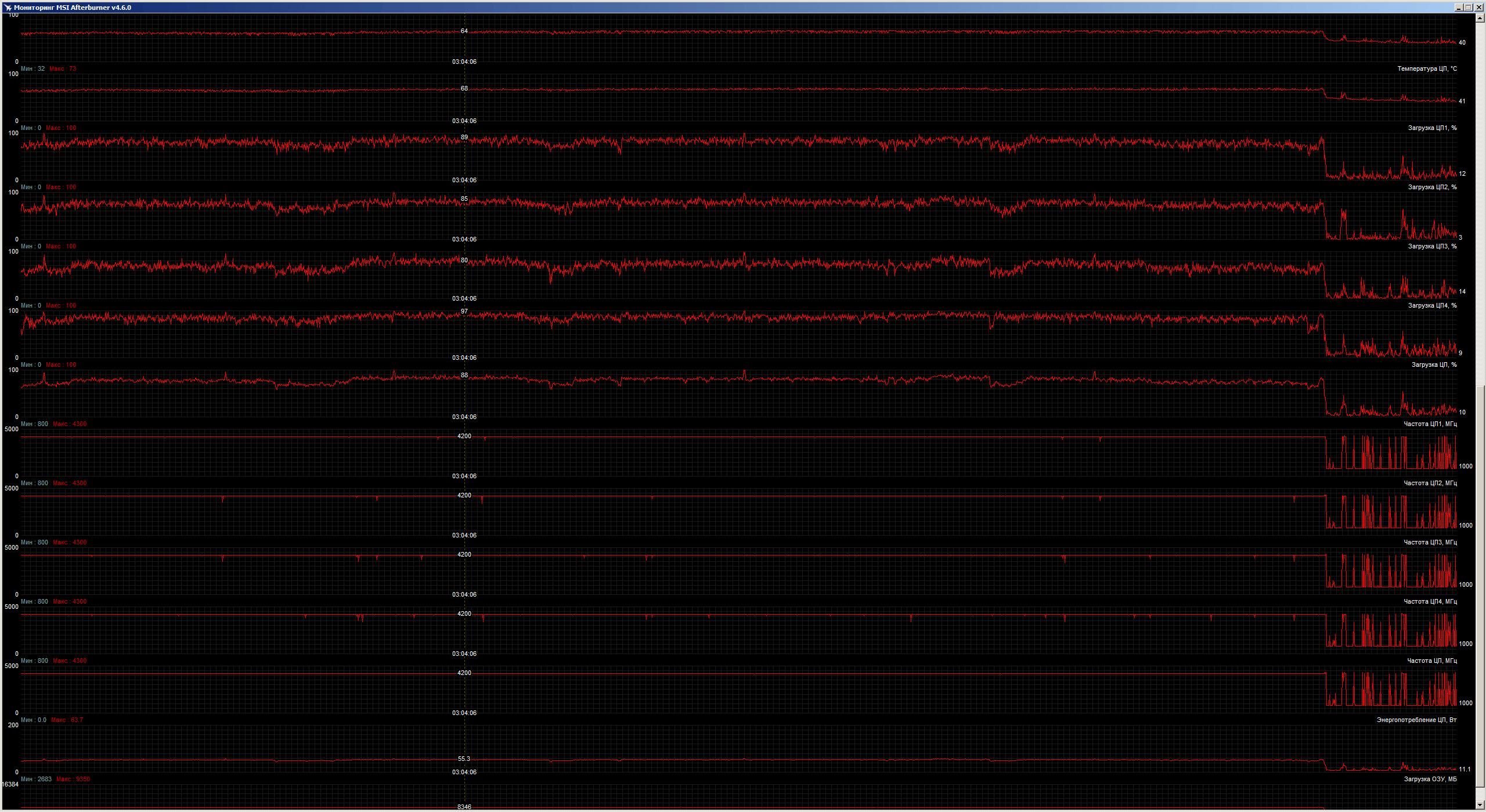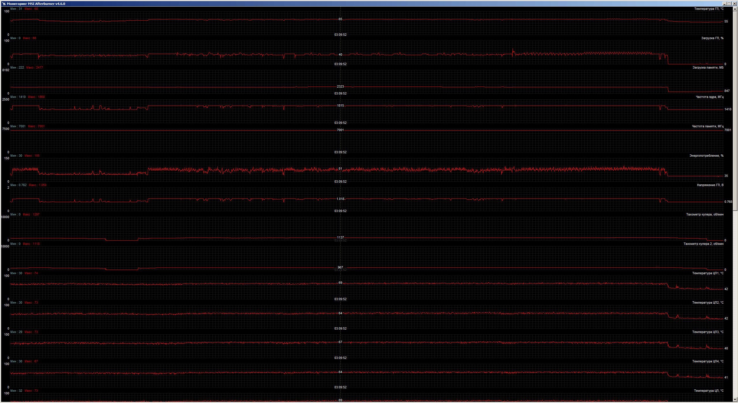 Вдруг кому интересно, в качестве информации к размышлению выкладываю скрины мониторинга MSI AB после игры в The Crew (первая часть) с настройками FHD, все остальное на максимум, вертикальная синхронизация включена. Карта MSI RTX 2070 Gaming 8G, проц i5-4670K (@4200), память 24Гб. Видно, что разогнанный проц не справляется, видюху вообще не слышно. Увеличение разрешения до 2560х1440 (нативное для монитора) приводит к появлению редких фризов в локациях со сложной геометрией (это, в основном, в городах).