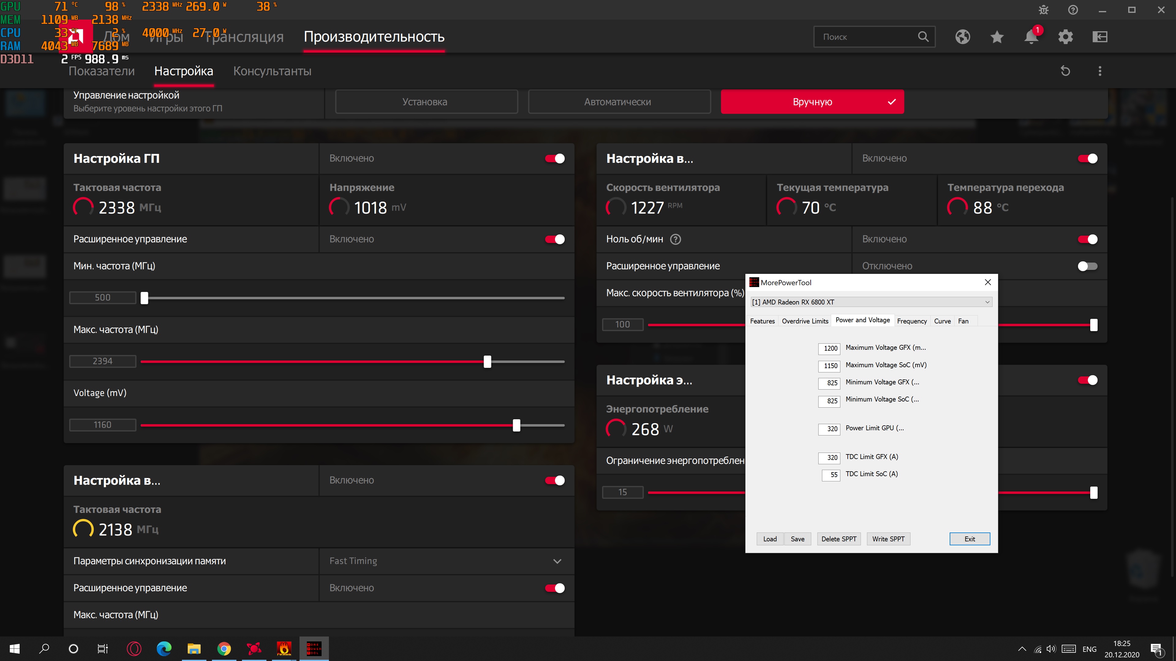 vorvort так прикол в том, что вольтажа как раз ей хватает, первый раз когда я выставил 2700Мгц, у меня были низкие показатели в 3дмарк, ниже вроде даже чем режим rage, потом когда добавил мощности 24ватт в MPT картина сразу кардинально поменялась, потом добавил ещё 11 ватт и снова сильный скачок в производительности, так вот вопрос нужен ли был вольтаж, если и так производительность сильно растёт. Бесспорно можно гнать и дальше, но думаю не на охладе рефа.