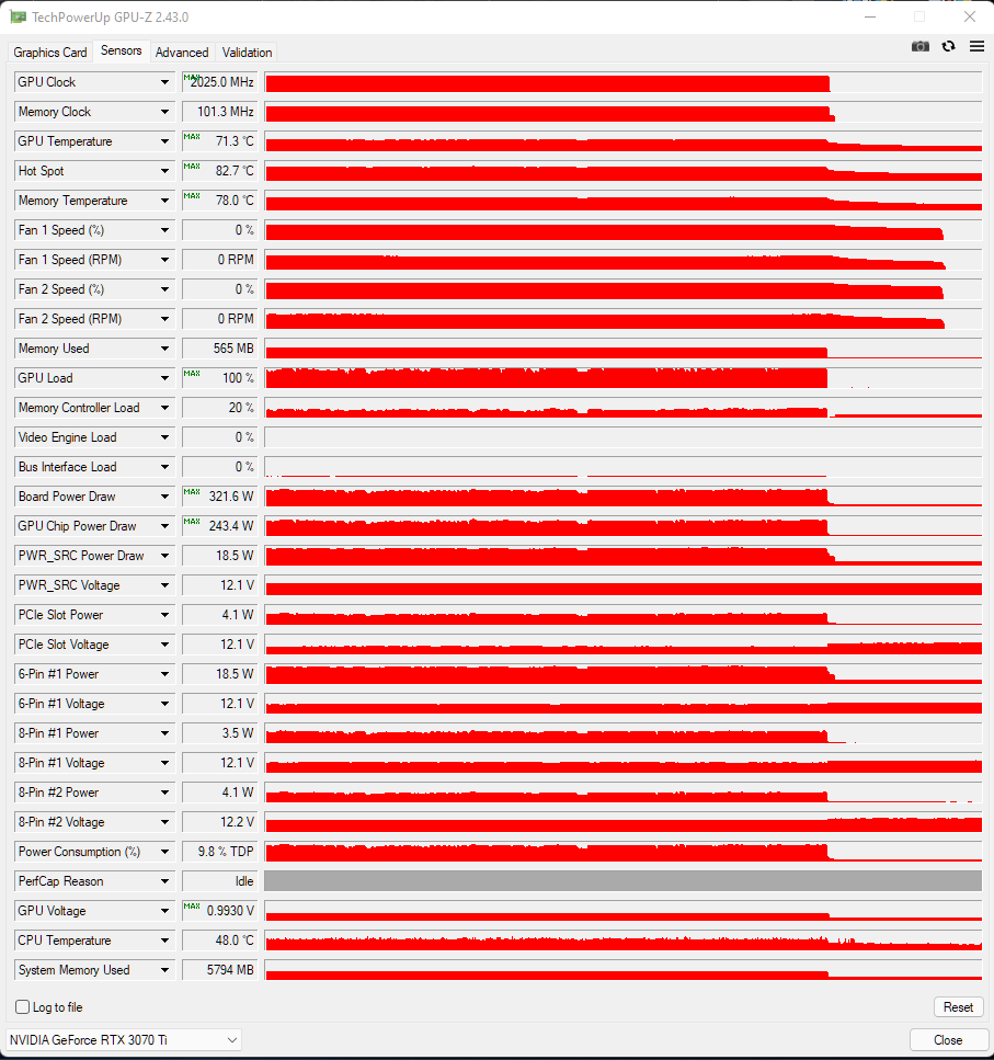 Вставлю свои 5 копеек. Карта профильная GigaByte AORUS GeForce® RTX 3070Ti MASTER 8G (rev.1.0). Напишу про нее, так как она здесь довольно редкий гость. Сразу после покупки (около года назад) была разогнана до 2010MHz 0.993v. Нужно бы поподбирать напряжение, может, и на меньшем будет работать, но пока всё руки не доходят. В этом режиме карта бустит иногда до 2040 MHz, но в тяжелых играх держит 2025-2010 MHz. Карта достаточно холодная и тихая (до 80% вертушки мой слух не напрягают). Тяжелая, поэтому пришлось ставить подпорку. В простое со всеми включенными подсветками и дисплеем потребляет 25-27W