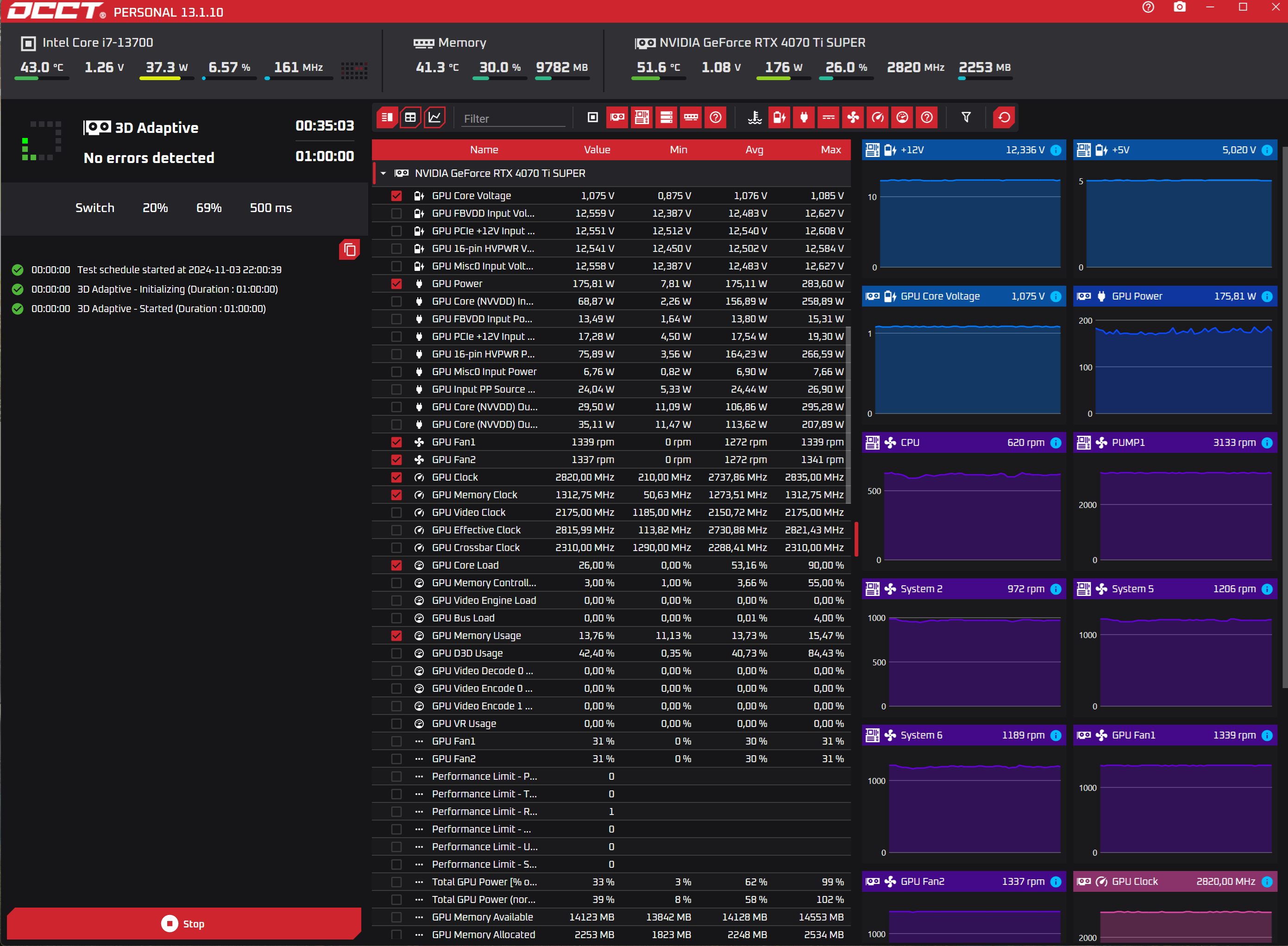 Видео-карта Gigabyte RTX 4070 Ti Super Gaming OC 16G пользуюсь с февраля этого года все было вроде нормально но пару недель назад начали зависать игры после 20-40мин игры, виcнет картинка потом вылетает на рабочий стол без каких либо ошибок, разгона нет если не брать в расчет заводской, андервольта нету, то-есть работает в стоке как из коробки, гонял 30-мин в FurMark и OCCT температуры нормальные не каких ошибок нет, драйвера переустанавливал с удалением в безопасном режиме с Display Driver Uninstaller, биос на материнской плате обновлял, оперативную память сбрасывал с XMP в сток, нечего не помогло, вспомнил что когда то давно была карта тоже с заводским разгоном и тоже спустя какое то время пользования ей она выдавала примерно такие же фокусы с вылетами в играх, тогда рекомендовали сбросить разгон убавить частоту графического процессора, (пока не пробовал) но интересно из за чего больше пол-года все работало идеально и тут бац в один момент все стало глючить зависать и вылетать учитывая что не какого разгона нету, еще заметил что в том же OCCT он карту жарит на пониженной частоте графического процессора то-есть 2340МГц по этому наверно и ошибок не каких нету а в играх она больше 2820МГц, не знаю куда копать чтобы найти причину зависаний и вылетов.