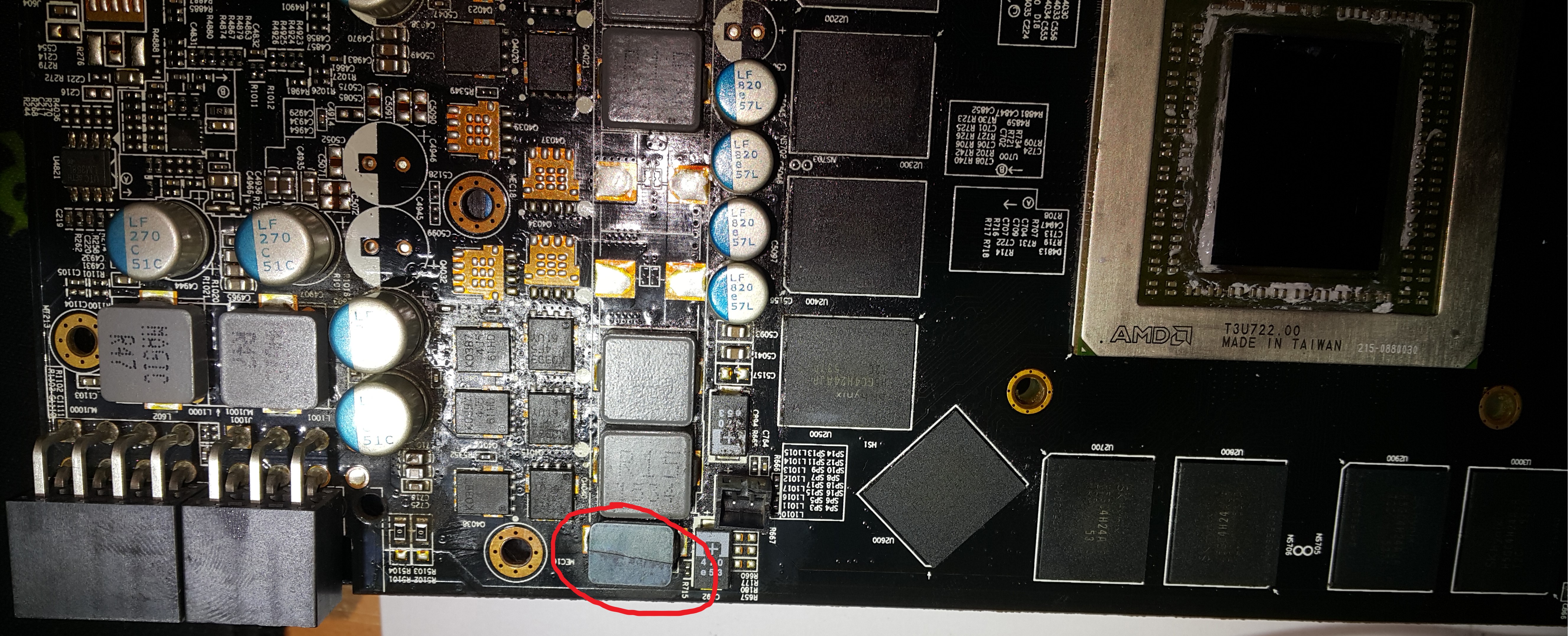 Здравствуйте, уважаемые форумчане. Перестала работать видеокарта Gigabyte Radeon R9 390 G1 Gaming. Точнее она работает, но когда идет нагрузка на видеокарту система полностью зависает, в 2D режиме проблем нет. Разобрал карту, обнаружил треснувшую фигню )). Прошу помощи в определении данной детали для замены, что это такое, каким аналогом можно заменить. Фото в приложении. В обзоре на данную видеокарту нашел фото
