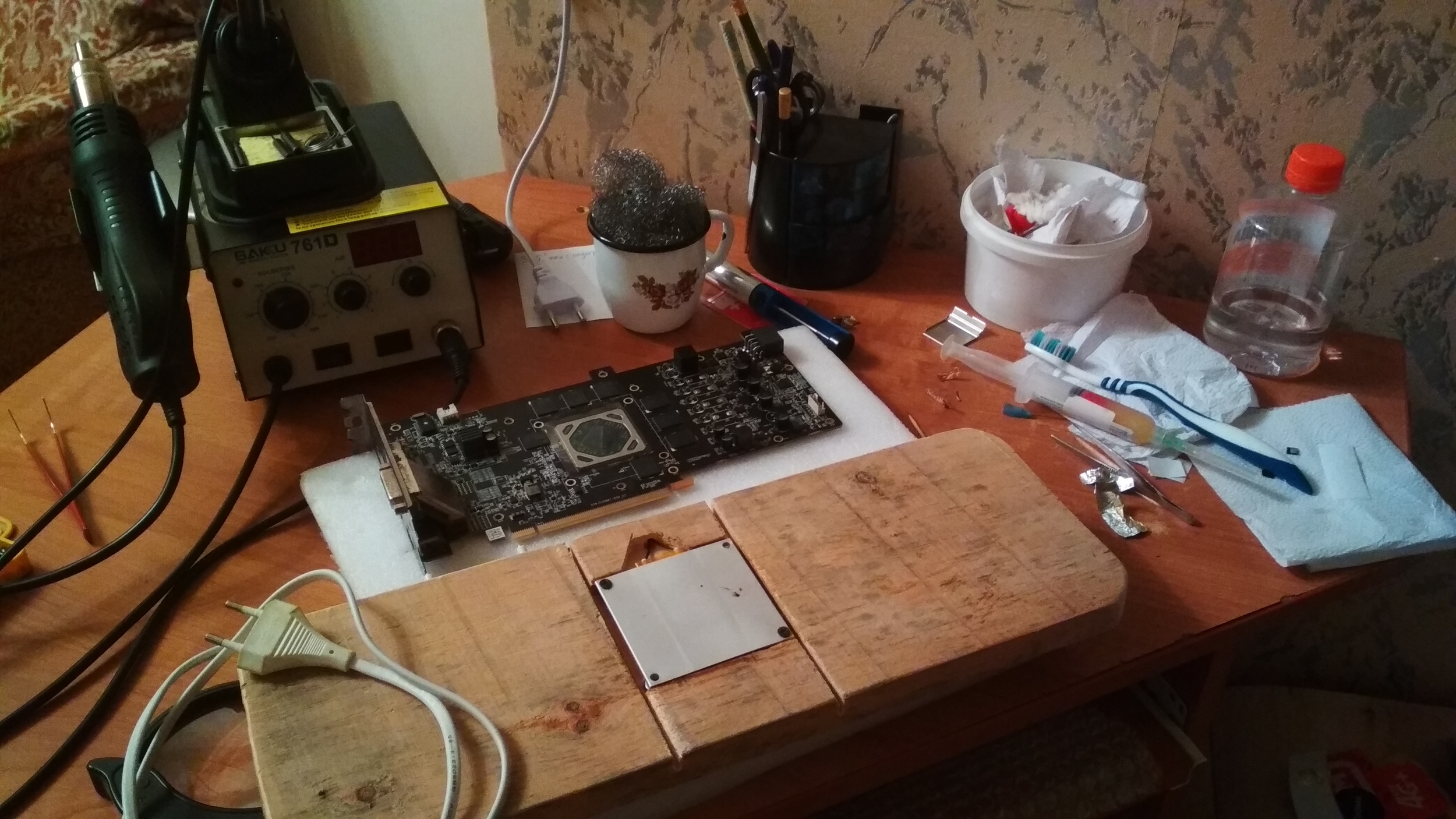 Замутил себе нижний подогрев как тут советовали, вообще вещь! За 400р За сегодня уже у двух видеокарт поменял мосфеты на столе подопытная RX570 8GB с новыми мосфетами
