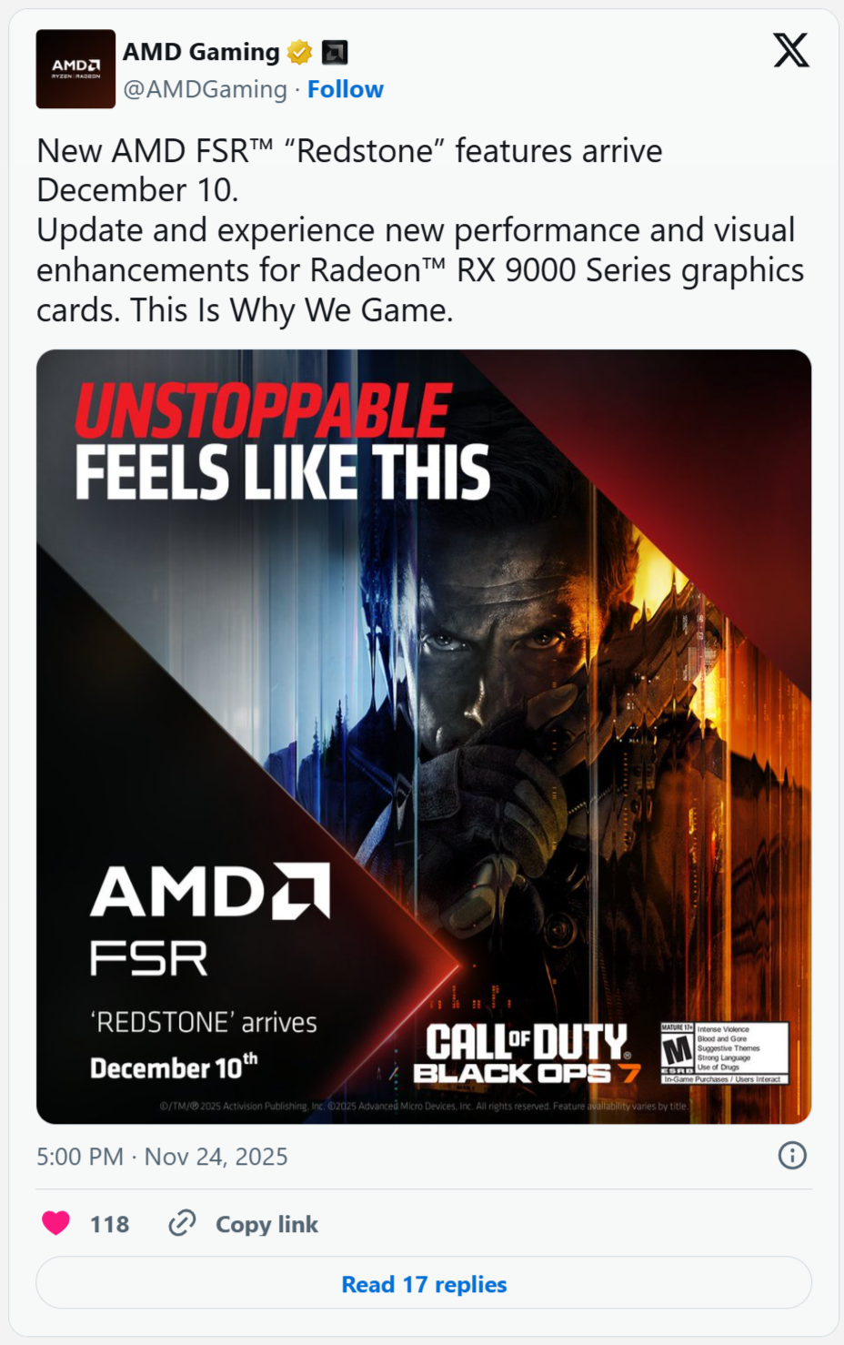 AMD опубликовала новый промо-ролик для Call of Duty: Black Ops 7, посвящённый обновлению FSR Redstone, в очередной раз подтвердив, что оно ориентировано на видеокарты серии Radeon RX 9000. В публикации в социальных сетях повторяется дата запуска — 10 декабря, а набор функций связан с новой линейкой AMD на базе RDNA 4, что соответствует более ранним заявлениям о том, что Redstone разработан для новейшего оборудования Radeon.