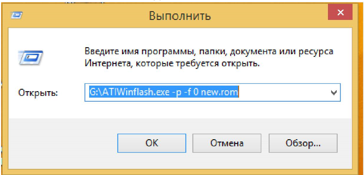 Если ATI Winflash откажется прошивать тогда прошиваем с ключами из выполнить. Порядок действий такой--- Форматируем флешку в NTFS, копируем на нее ATI WinFlash без папки и отредактированный Bios карты.Далее в меню пуск нажимаем выполнить и выбираем флешку у меня оказался диск G и выбираем на диске файл ATIWinFlash.exe и вводим команду -p -f 0 new.rom ATIWinFlash.exe -p -f 0 new.rom все команды набирать через пробел и жмем кнопку ОК . После прошивки перезагружаемся. Если прошивка прошла не удачно и карта не грузится ,загружаемся с резервного Bios . Так команды выглядят в выполнить.