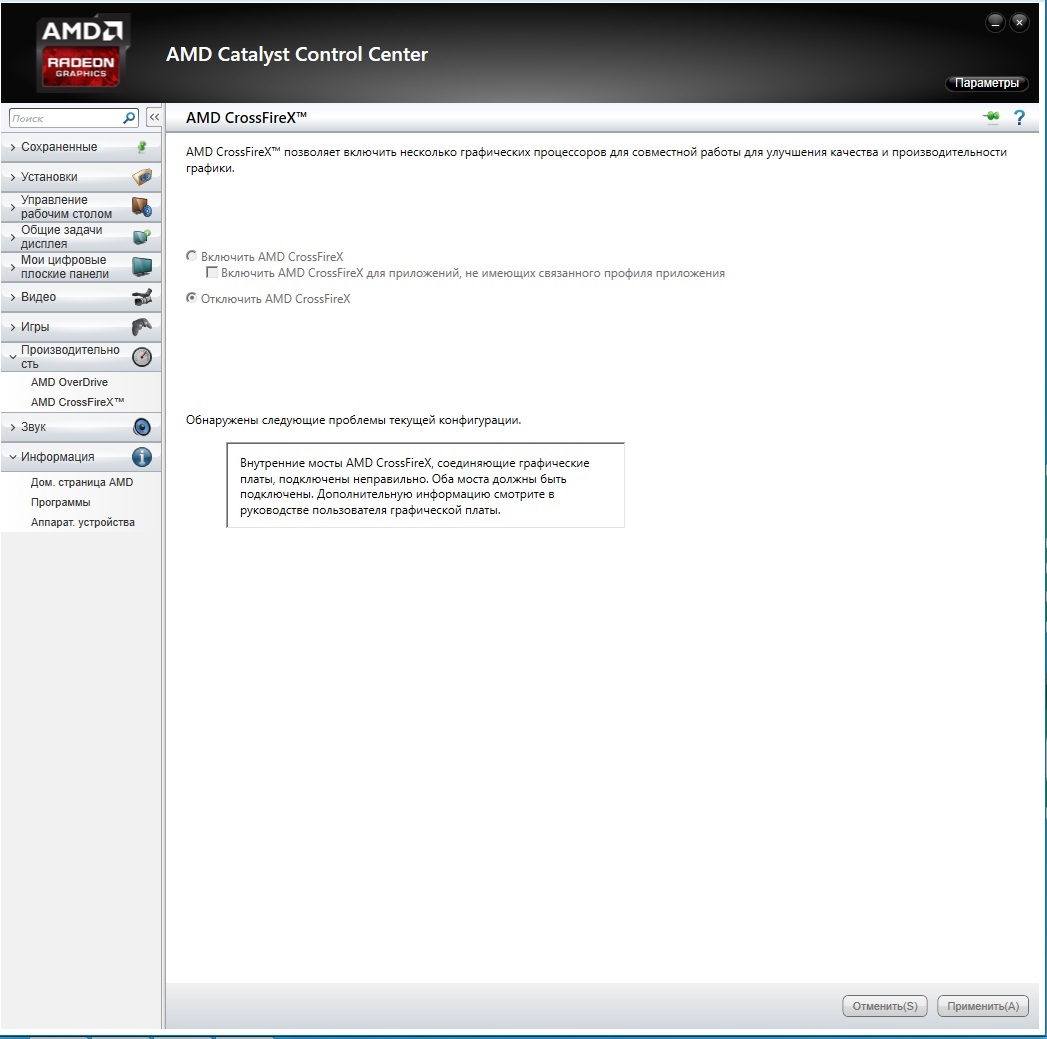 Всех приветствую! Нужна помощь знатоков CF. 2x270x(gigabyte GV-R927XOC-2GD) Asrock Z77 oc Formula i7-3770k Проблема в следующем: Не могу включить CF в ССС. Пишет что мосты подключены не верно. Пробовал и драйвера переустанавливать и мостик менял. Может в биосе мат. платы нужно что-то поменять или же у меня оба моста бракованные? А так все делал по инструкции, как написано в мануале к материнке и видеокарте, но там нет нечего полезного. Поделитесь информацией если кто что знает. Заранее спасибо.