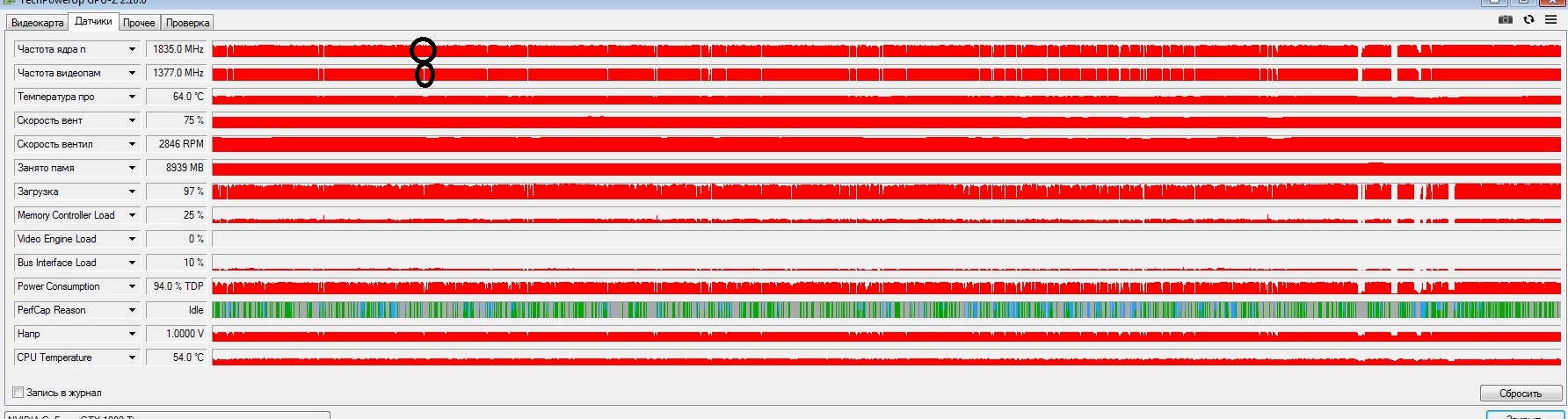 Парни, подскажите, это норм, что постоянно частоты проседают? Особенно напрягает просадка, которую обвел черным, обычно хоть ядро и память вместе ходят, а тут только память просела... Карта GV-N108TGAMING OC-11GD. Карте года два, ничего с ней не делал.