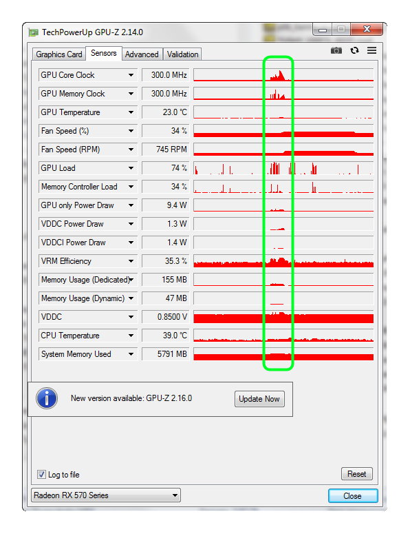 Снимок артефактов я не успел сделать, они быстро исчезли. НО единственное что получилось - это постоянно запущенный GPU-Z. На скриншоте я выделил момент когда выстрелили артефакты. По всем позициям виден скачок..но так как я не силён в этих графиках, то может кто-то подскажет..в чем действительно проблема, в видеокарте или блоке питания.