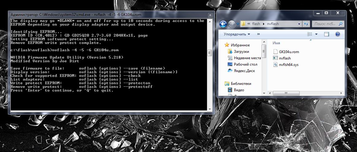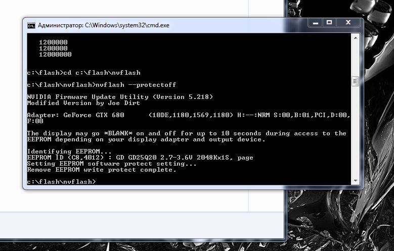 Ок, выкинул. Версия 5.265.0 Команды проходили, только если добавляешь 64, например nvflash64 --protectoff. Далее команды nvflash64 -4 -5 -6 имябиос.rom и nvflash -4 -5 -6 имябиос.rom ничего не дали. Команда nvflash64 -6 имябиос.rom снова вылет в черный экран(как в версии Джо) и слет драйвера. Чистка, установка, перезагрузка, биос сток.