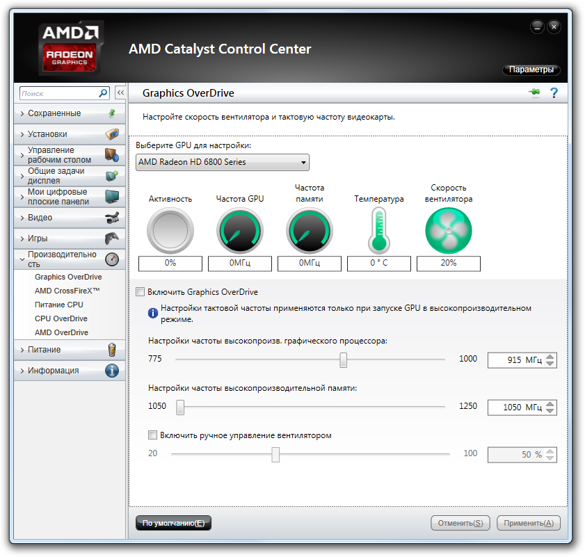 Всем привет! Досталась мне трофейная Radeon 6870. Решил Кросом кинуть к уже имеющейся 6870. Все вроде бы прошло гладко - система увидела мостик, увидела вторую видеокарту, предложила врубить тот самый заветный CrossFireX. Вроде бы все замечательно, даже в тестах 3D Mark показывает результаты на 40% выше, чем с одиночной картой, но вот смущает такая ситуация....открываем CCC, идем в "Производительность", потом в "Graphics OverDrive" и там видим состояние главной видеокарты. Выбираем вторую видеокарту, и там не видать загрузки ГПУ, частоты ГПУ и памяти на нулях, температура в нулях, и вечные 20% кулера....ладно, понимаю, нет на нее нагрузки, вот и отключилась, но температуру хотя бы показывать должен ведь? разве нет? да и первое время там все показывалось нормально, а сейчас вот так как-то. Скрины волнующего вопроса приаттачил. Начинка корпуса в профиле