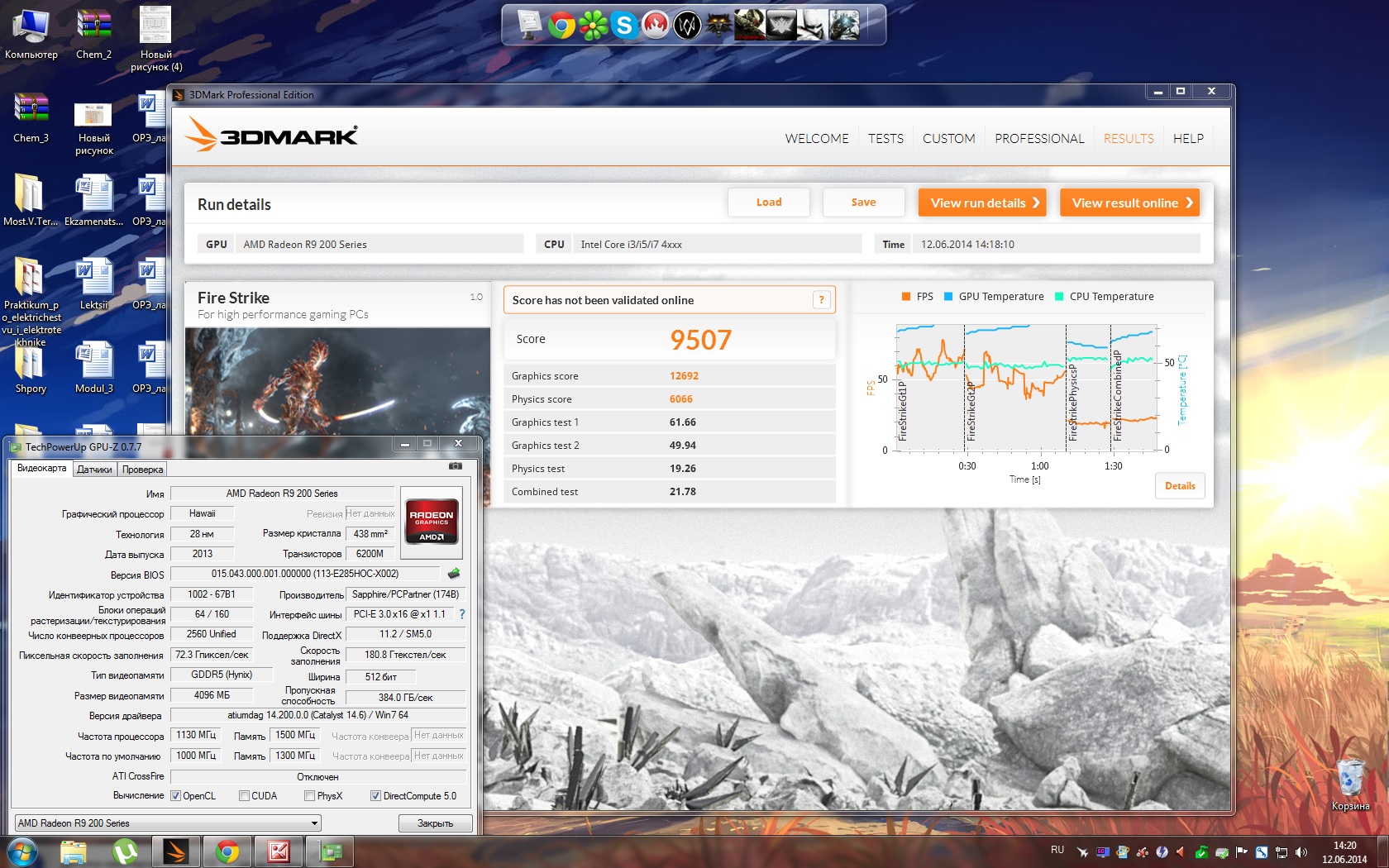 TgR Главное задачей было превзойти? Тогда держи и готовь шляпу. Карта далеко не в максимальном разгоне(максимум я проверял - 1200мгц с +70mv и 1570мгц память, но я боюсь за свой БП 550w... так лишний раз разгонять карту и он может грохнуться, ему 6-ой или 7-ой год к тому же). В макс. разгоне(1200 ядро и 1570 память) было 13076 баллов за видео или что-то около того. Ну и fps был за первый тест 64.8, второй 52.3, остальные не помню. Скрин не делал. Для таких частот(как на скрине) поднял лишь вольтаж ядра на +31mv. Как куплю норм БП буду юзать в макс. разгоне.
