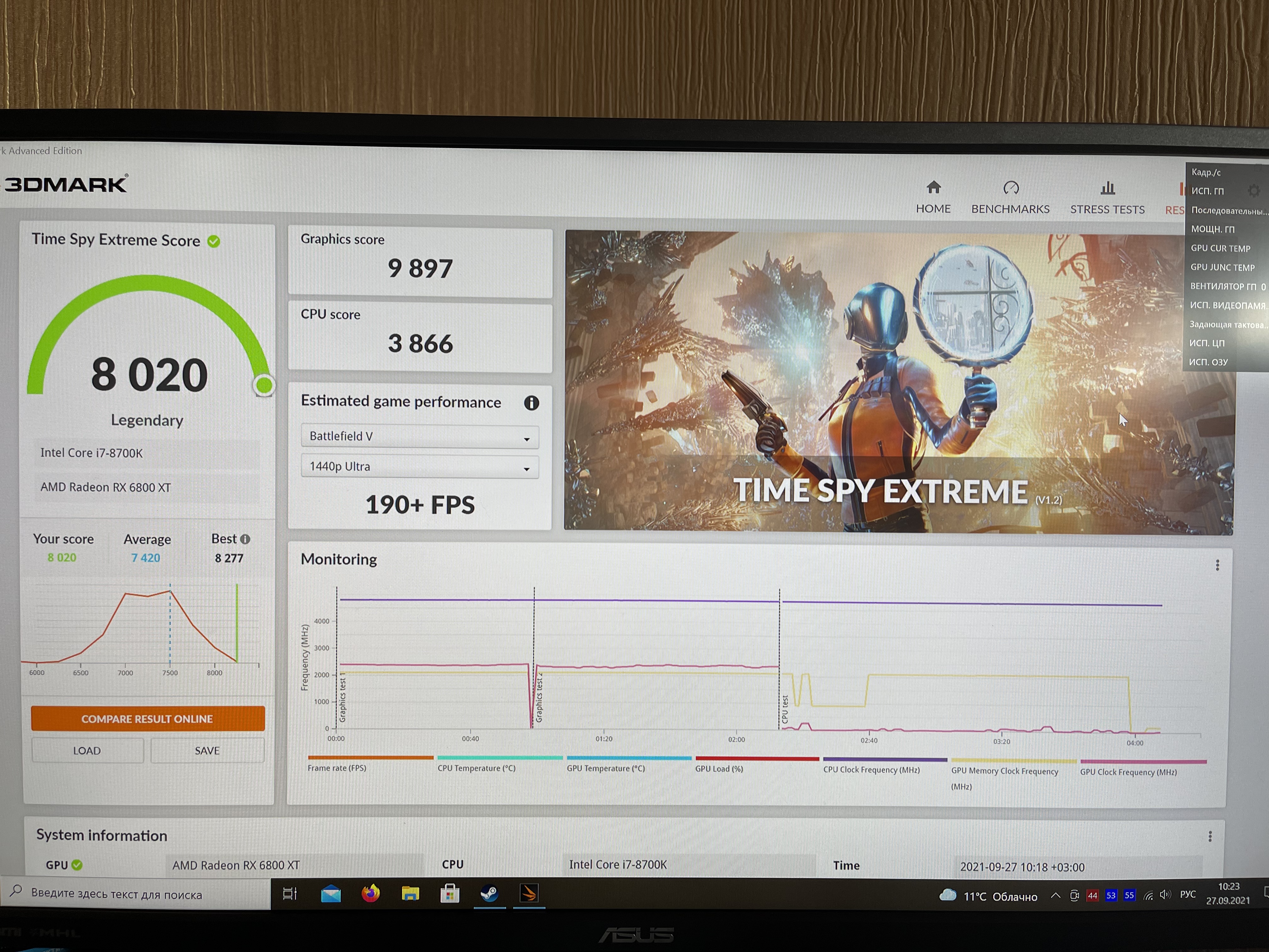 И это все на воде температура не выше 70 в фурмарке, потребление 425вт Частоту видеопамяти не трогаю, мне кажется она не влияет на производительность, могу ошибаться, не нашёл сравнительных тестов частот видеопамяти