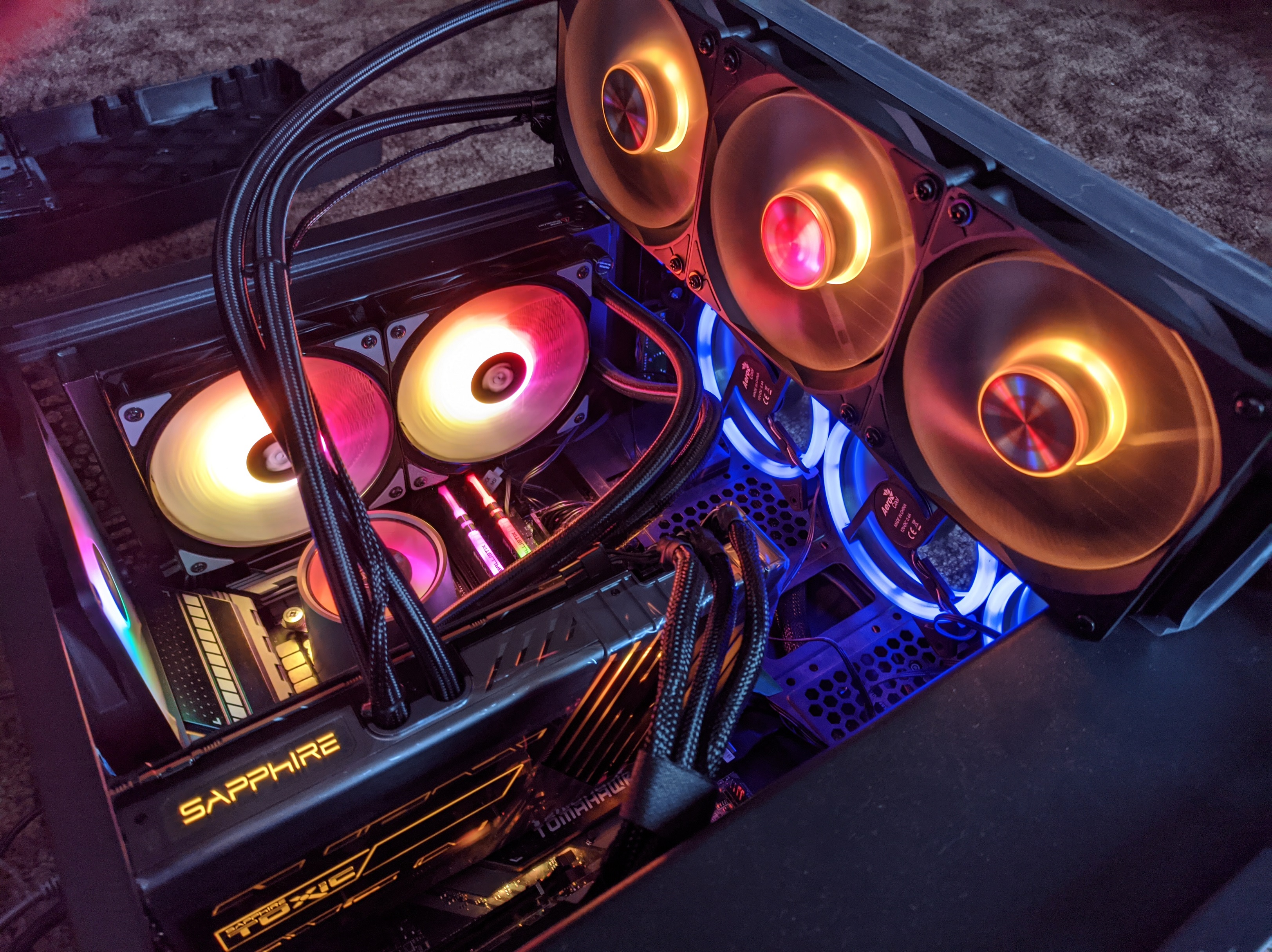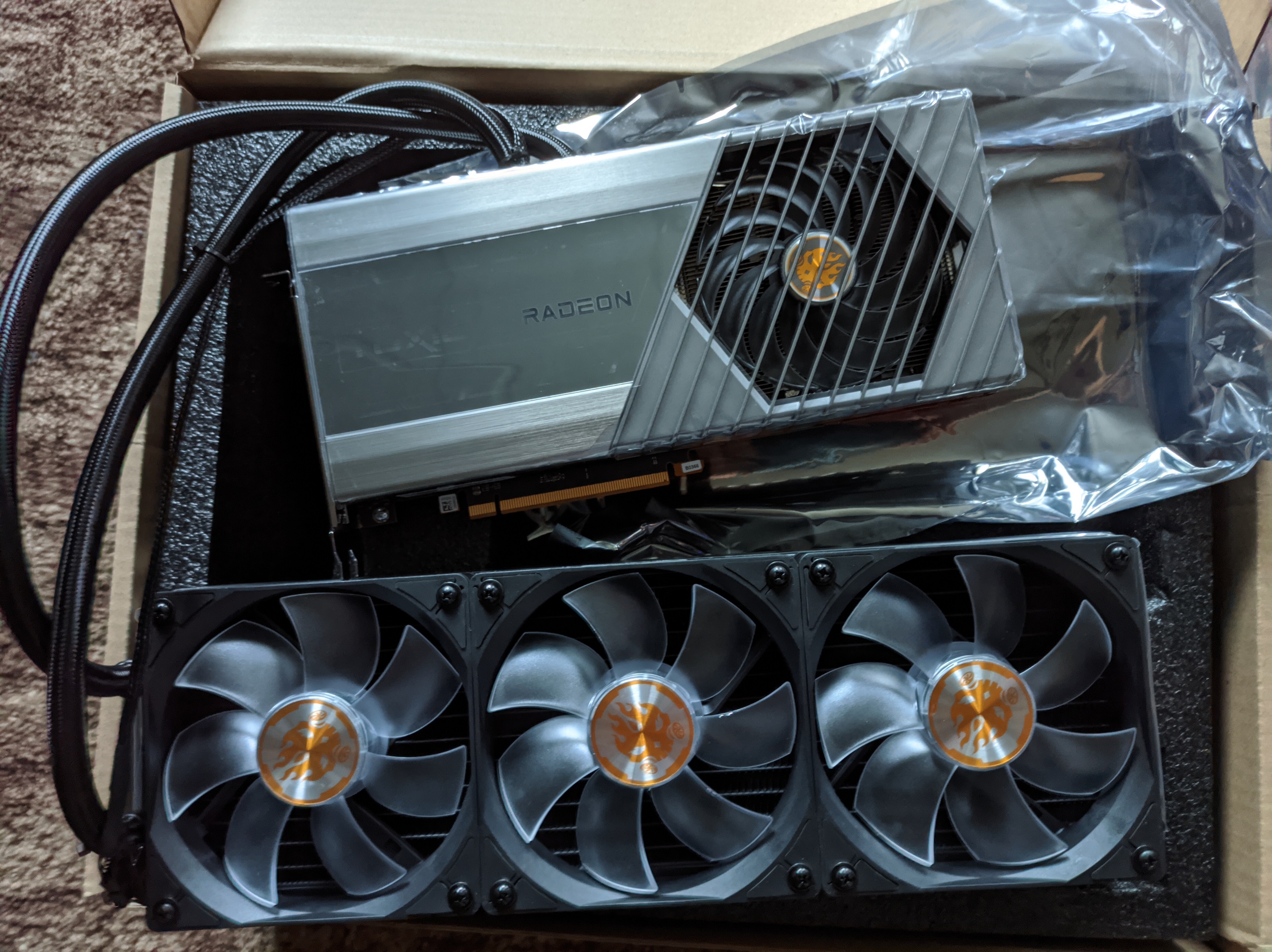 По темпе и шуму. Карта не очень тихая, в разгоне с постоянным 380вт потреблением в закрытом тесном корпусе (корпус что на фото выше, но уже с установленной внутрь картой и закрытой крышкой) максимально 60гр по чипу и 85 гпу хот спот (скакало до 87 судя по хвинфо), memory junction около 78 макс. Вертушки раскрутились за пару часов до 1380об, что тише любой карты на воздухе которая у меня была из хай сегмента, но никакой гробовой тишины тут нет. Когда тестил с радиатором вне корпуса темпы были 55гр чип, 80макс гпу хот спот и память что-то около 74, вертушки ~1200 В стоке редко поднимается выше 1000об и это действительно очень тихо. Хотя есть неприятный ньюанс: когда идет нагрузка то вертушки сначала раскручиваются на максимум создавая хорошо слышимый поток и только через секунду-две понижают обороты до нужных. Лечится отключением "ноль об\мин" в дровах. Помпу так же слышно если сидеть близко в полной тишине, она издает некий гул, который выделяется на фоне корпусных. Есть небольшой свист катушек, в закрытом корпусе практически не слышен.