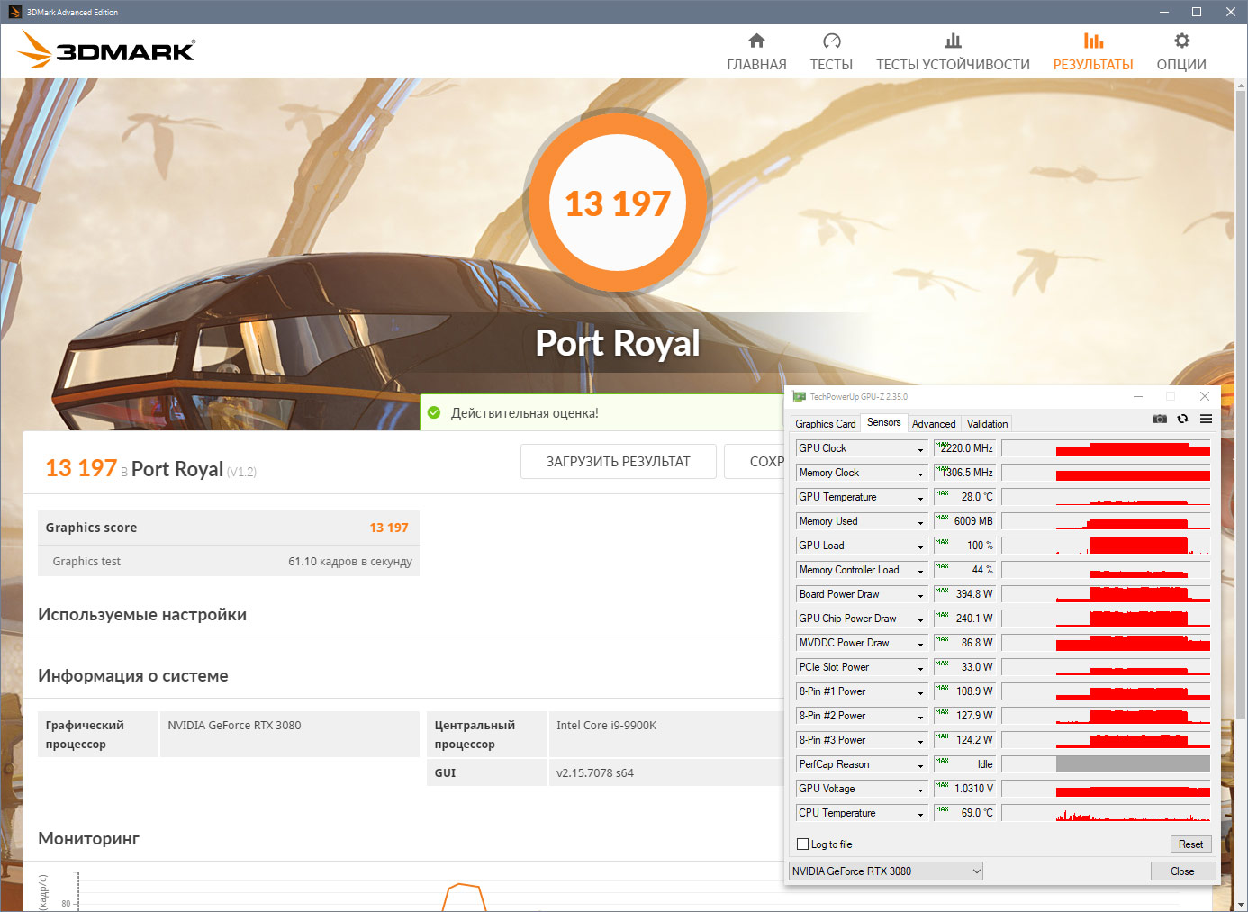 Спасибо за наводку. Запустил, выставил настройки в пол и подождал 20 минут в меню, для верности (потом ещё поиграл, не удержался, хоть и проходил). Всё стабильно, при автоматической курве вентиляторов видеокарта прогрелась за всё время до 76 градусов и до 2100 рпм. Частота скачет постоянно 2040-2055. Вентиляторы не воют, хотя всё что касается акустического комфорта и правда очень субъективно. В метро моя Евга потребляла 461 ватт.