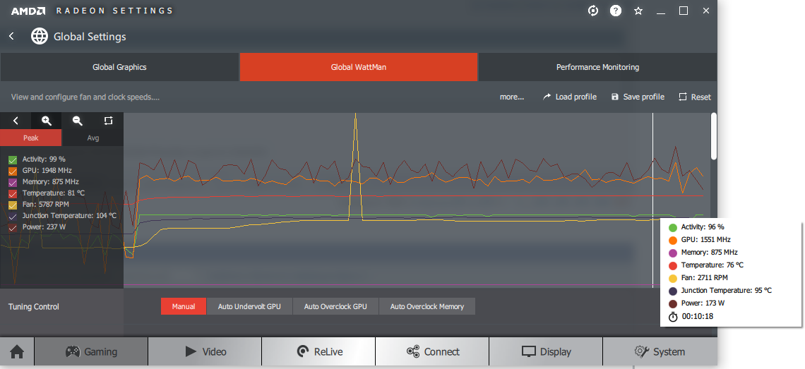 5700xt red dragon, это нормально?карта вообще не держит свои частоты а при поднятии поверлимита греется просто жесть, скрин без поднятия поверлимита, вольтаж 1.1 на 1900мгц. p.s если что пиковые данные слева были при поднятии павер лимит до +20