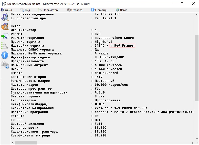 Ref проще всего посмотреть через mediainfo (бесплатная программа, показывающая много полезной информации из медиафайла https://mediaarea.net/en/MediaInfo). Настройки при первом запуске сделайте такие: язык русский, вывод текст, остальное по умолчанию можно оставить. При клике правой кнопкой мыши программа выводит информацию такого вида: