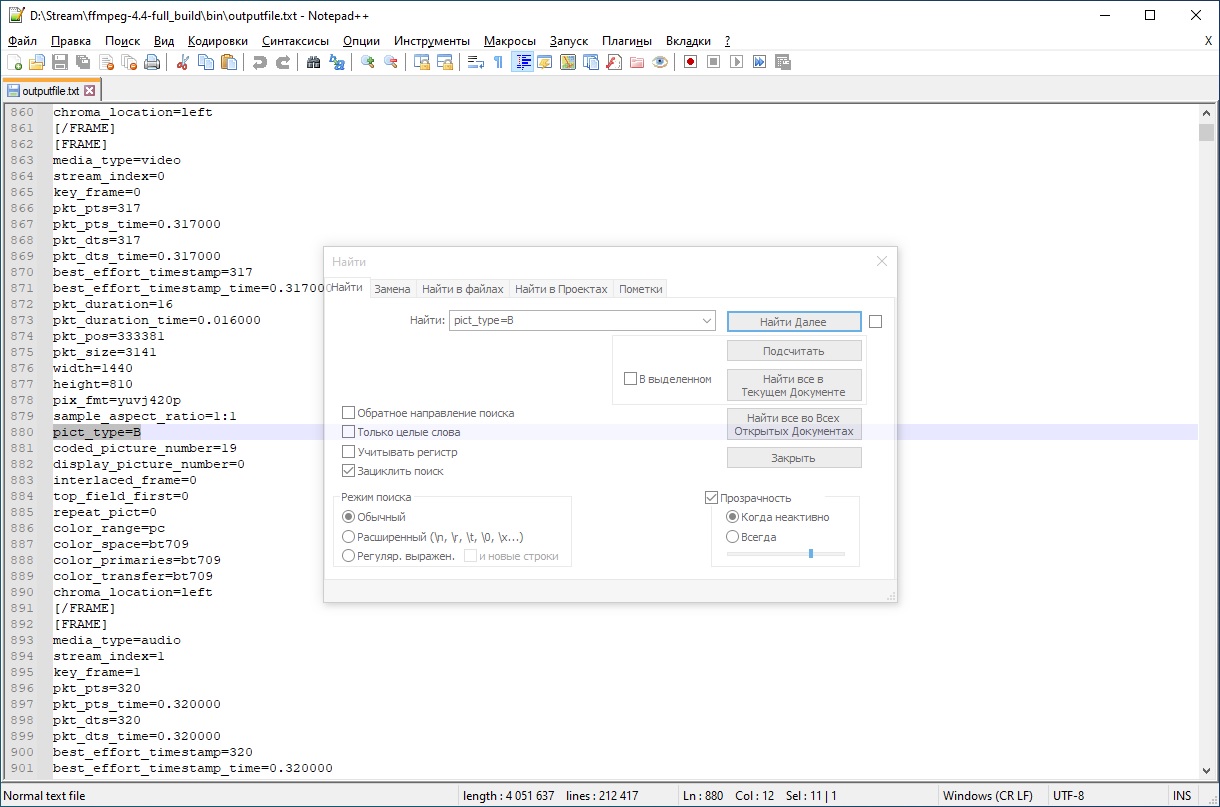 Где 1.mp4 - это сам видеофайл (). Кидаете нужный 1.mp4 в папку где лежит ffprobe.exe, туда же наш батник и запускаете, после чего будет отчет в файле outputfile.txt. Отчет будет по всем кадрам в видео, поэтому желательно чтобы видеофайл был не слишком длинный (минута вполне достаточно), а то программа будет дольше обрабатывать, да и сам outputfile.txt будет слишком большим. Так как сам outputfile.txt даже с минутой видео довольно большой (в нем статистика всех кадров), то его лучше открыть через Notepad++ (можно через браузер с возможность поиска ключевых слов). Открываете файл, далее сверху поиск и самое первое "найти". Вставляете в поиск запрос "pict_type=B". Если в видео b-кадров нет, то поиск выдаст "нет совпадений". Если есть, то будет вот так: