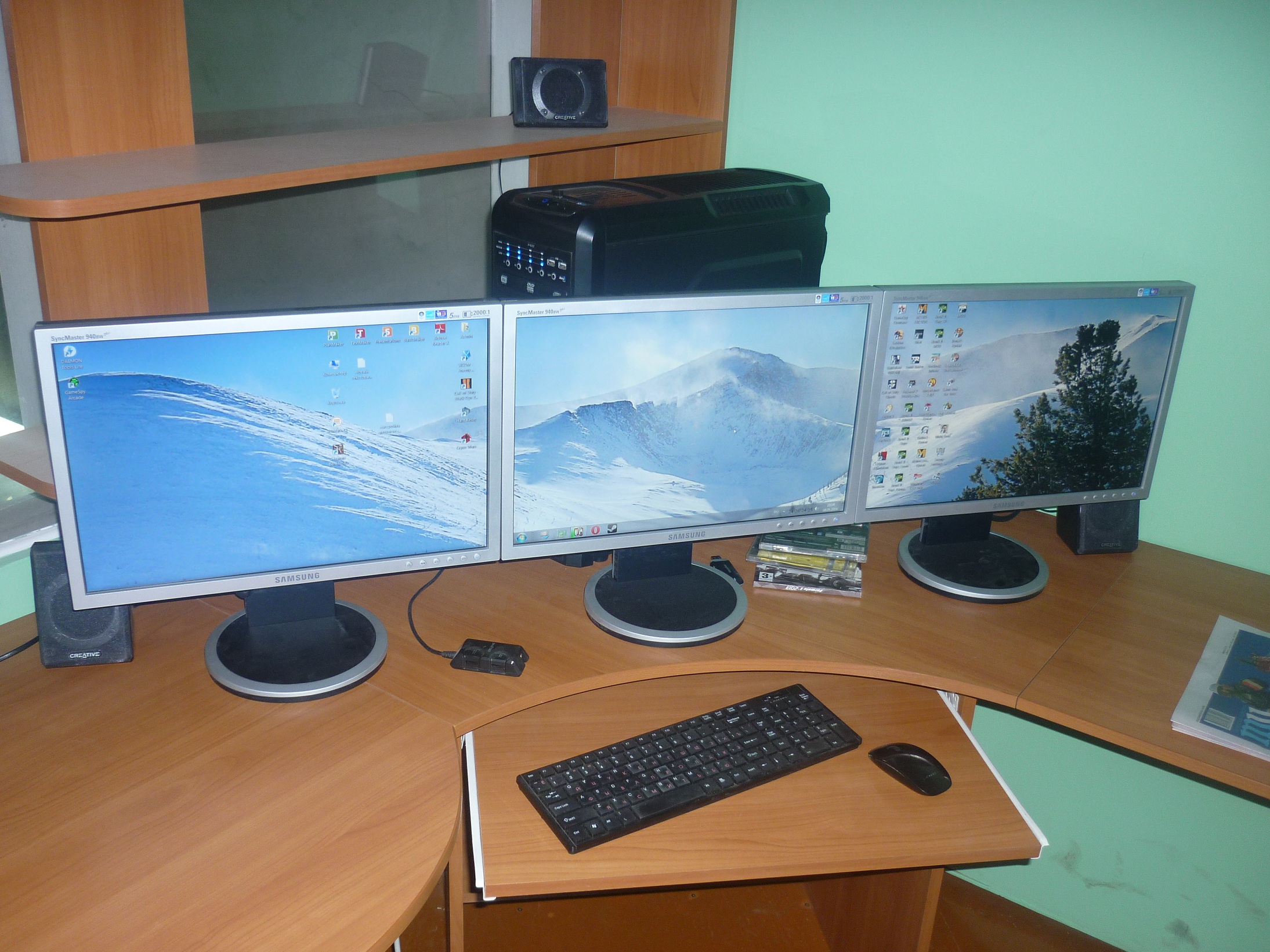 имхо где ж тут обустроено, вааще не представляю как можно юзать мышку на такой узкой поверхности, и рамищща у моников тоже приличные, не лучше наложить хотя бы друг на друга чтобы одна рамка была от моника? пыль на полочке