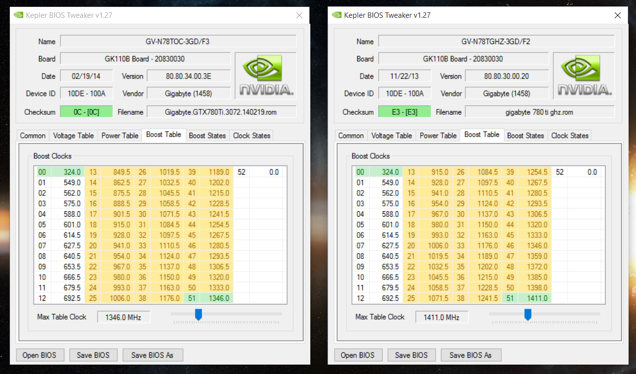 ParKur 1.28 у тебя без сторонних прог всё равно будет макс 1.212. частота макс буст только методам подгона под конкретные экземпляр. Так что KeplerBiosTweaker в руки и вперёд. Ток навсякий нужно иметь запасную видеокарту (если на твоей нет запасного биос или ты не уверен в своих силах на 100%). Если начнуться глюки с виндой и нет флэхи с запасным биосом ,чтоб откатится спокойно, в безапасном режиме удаляешь все дрова на карту, грузишь обычный режим, там шьёш бэкап(ну или исправленную версию), ребут и сново ставишь дрова. Инет лучше вырубить чтоб винда драйвер не подхватила с нета и в момент прошивки у тебя синька не вылетела.