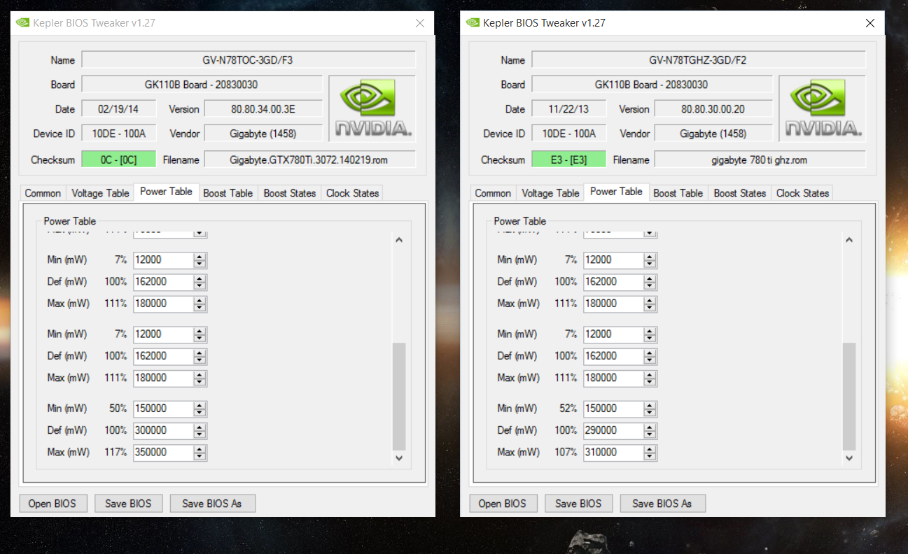 kast На 10ке 1500 не берёт( И вообще глюки появились три дня боролся с синькой nvlddmkm.sys. Помогла постановка дров от мп для вин 8 (Rampage4Formula) и прошивка нетронутого ничем биоса, потомучто с изменённым сразу вылетал nvlddmkm.sys. Сейчас поправил только поверлимит до 375 (2х150 + 75 от пси-ех), а на 7ке хоть 900 ставь, всё ок было. До этого (на 7ке) карта бустила на дефолте без сторонних прог до 1071, на 10 ке стала (с поверлимитом 375) бустить до максимально возможного значения прописсаного в boost table у меня это 1280, если сдвинуть в большую, то порог сдвигается, т.е. макс буст стал равен значению 51ой строки, тогда как в 52ой строке прописано значение 0. На 10 ке стало невозможно взламывать напряжение питания, как это можно было делать на 7ке. ->1500 теперь мне не доступна, макс для бенчей 1410 и стабильно для игр 1365. Да и то сейчас без прог сижу на бусте до 1280. Эксперементирую дальше. П.с. надоели танцы выставил на продажу, вк конеш хорошая, но 980ти хочется.
