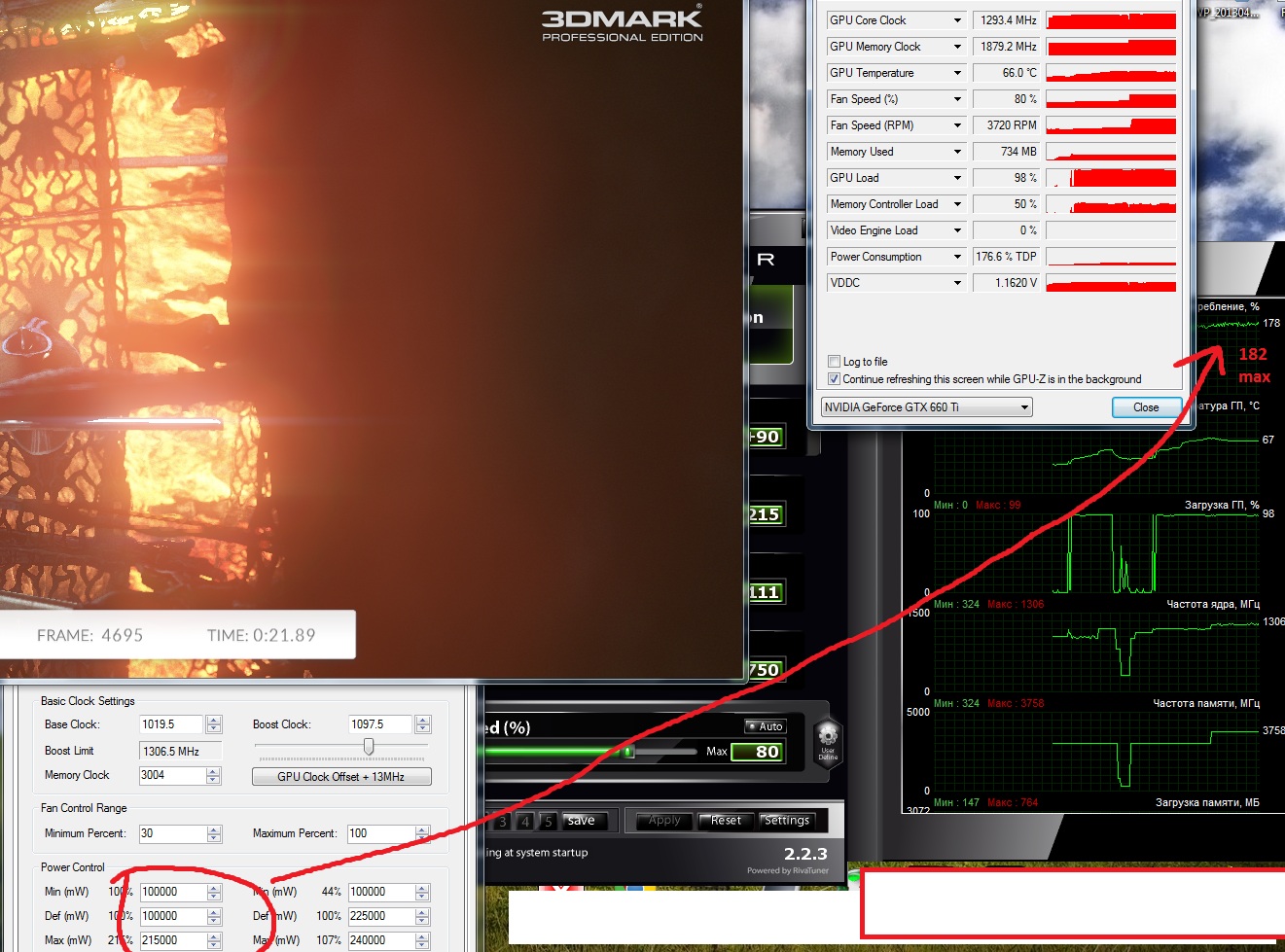 Если не прочь рискнуть, залочьте базовую частоту как я описывал выше, поставьте в правую колонку для вашей 660Ти 240 Вт в деф и 250 Вт в макс, в левую колонку в деф пропишите 100 Вт и запустите фурмарк. Потребление, которое он покажет в процентах будет соответствовать потреблению в Ваттах, и если оно будет отлично от 240% (от дефа в правой колонке), значит есть иная аппаратная или не найденная еще в биосе залочка.