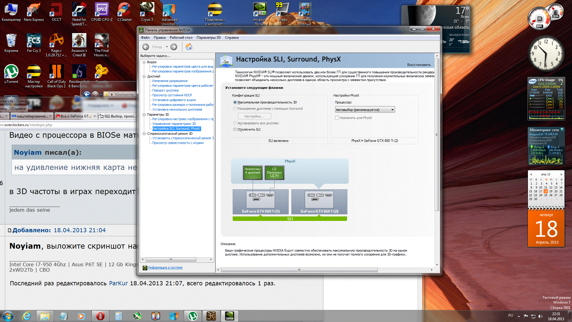 Куба, трудно решать проблему по фото. cblpop, тут наткнулся на такое, попробуйте: Заходим в "NVIDIA Control Panel" ,потом вибираем подменю "Manage 3D Settings", далее вкладка "Global Settings", в таблице параметров находим "SLI rendering mode" и из доступных значений выбираем "Single-GPU", сохраняем. Переходим в подменю "Configure SLI,Surround,PysX" и убеждаемся, что "SLI enabled".