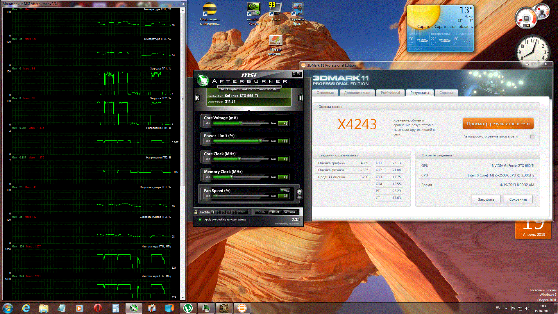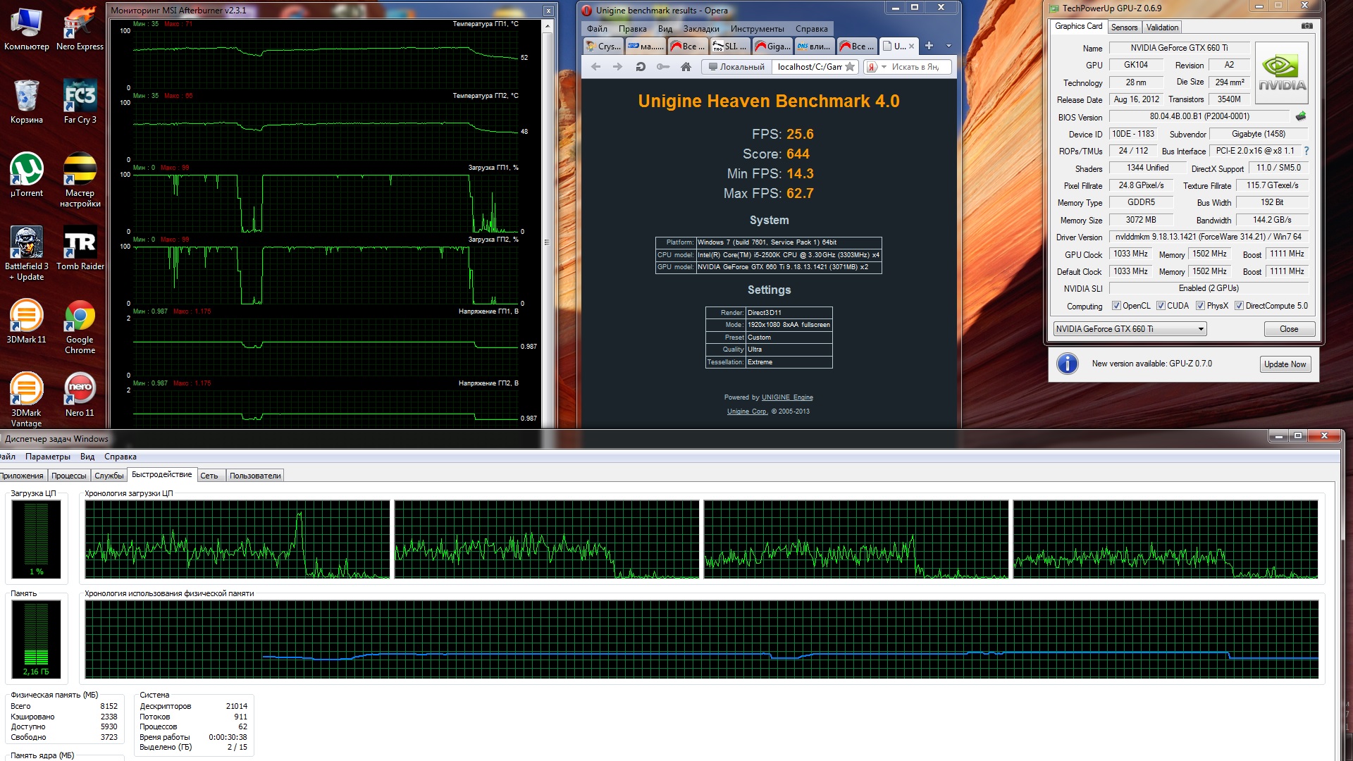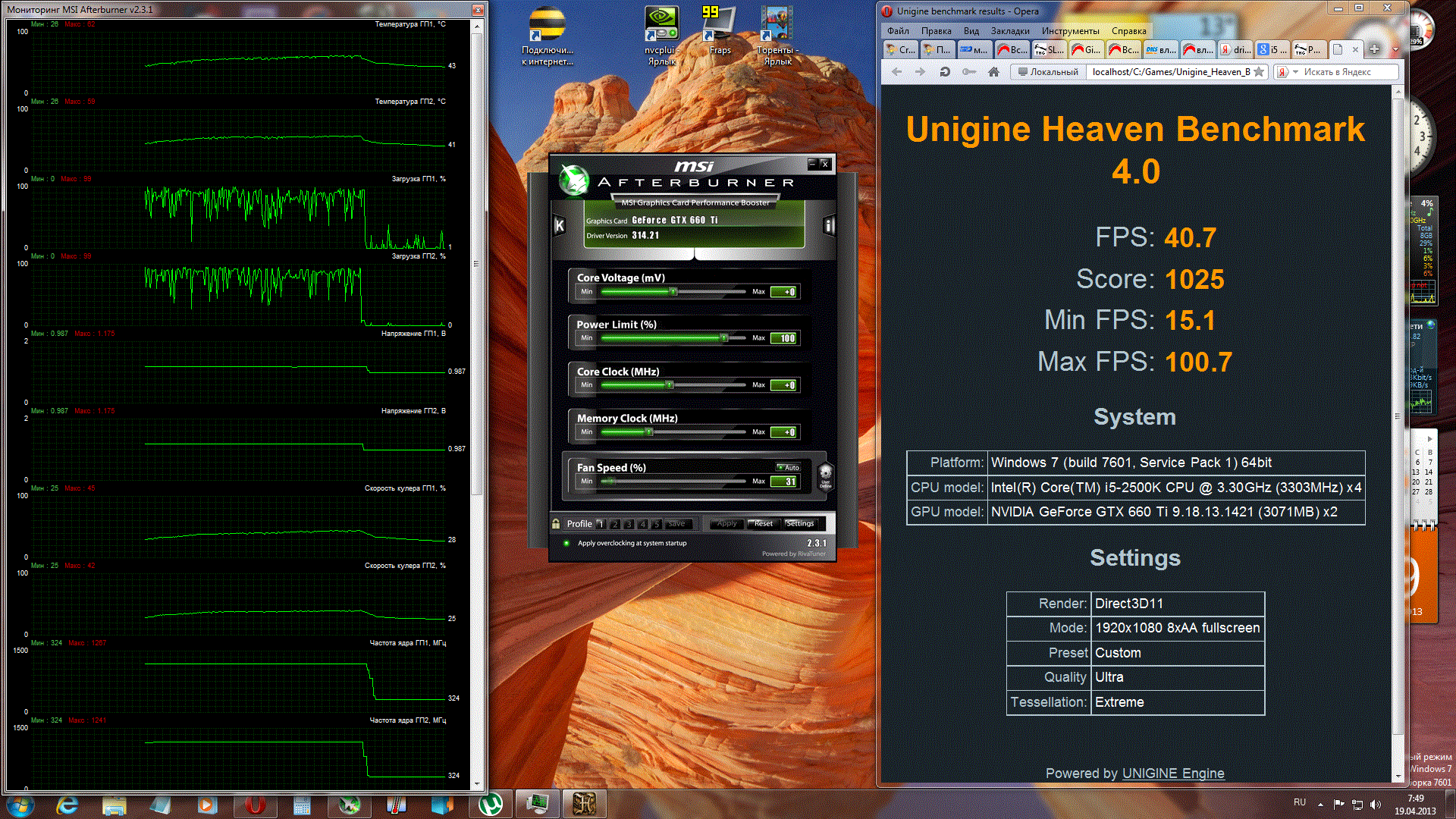 Noyiam MSI Afterburner запусти и покажи графики все (загрузка видях, TDP, температура, напруга) во время прогона хэвен 4.