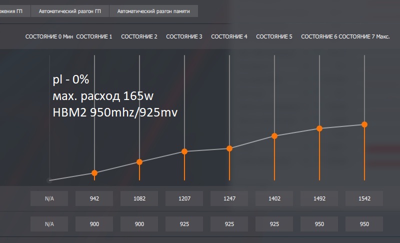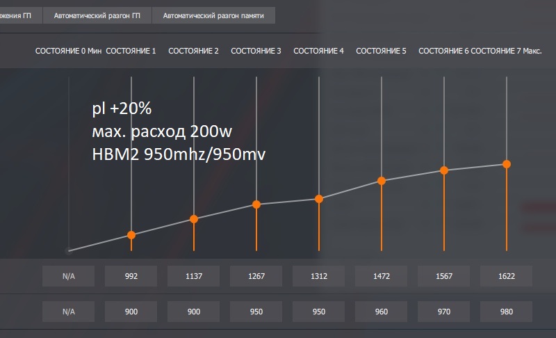 Товарищи бывалые юзеры Вег! У меня такая проблема, что новая MSI RX Vega 56 Airboost не хочет разгоняться. Выставляю Р6 Р7 как советуют гайды - выставленных частот не достигает и напряжение ниже того что я выставил. HBM2 память (Хуникс) вообще отказывается разгоняться, уже при 850 Мгц