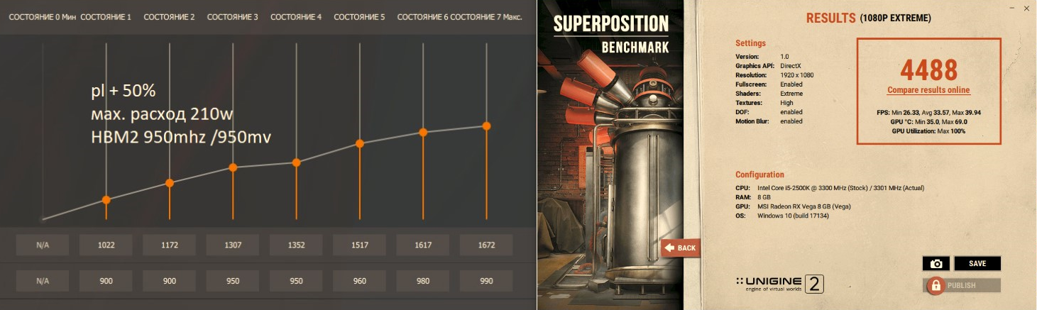 Вообще у меня система довольно таки старая... ай5 2500 в купе с 8гб оперативы PSI второй ревизии итд.... это к тому что попугаев могло было быть и больше... ну как есть так есть. По поводу Хуникса.... сразу поставил 950 и забыл.... 970 уже появляются артефакты. Напругу памяти при этом даже не трогал.