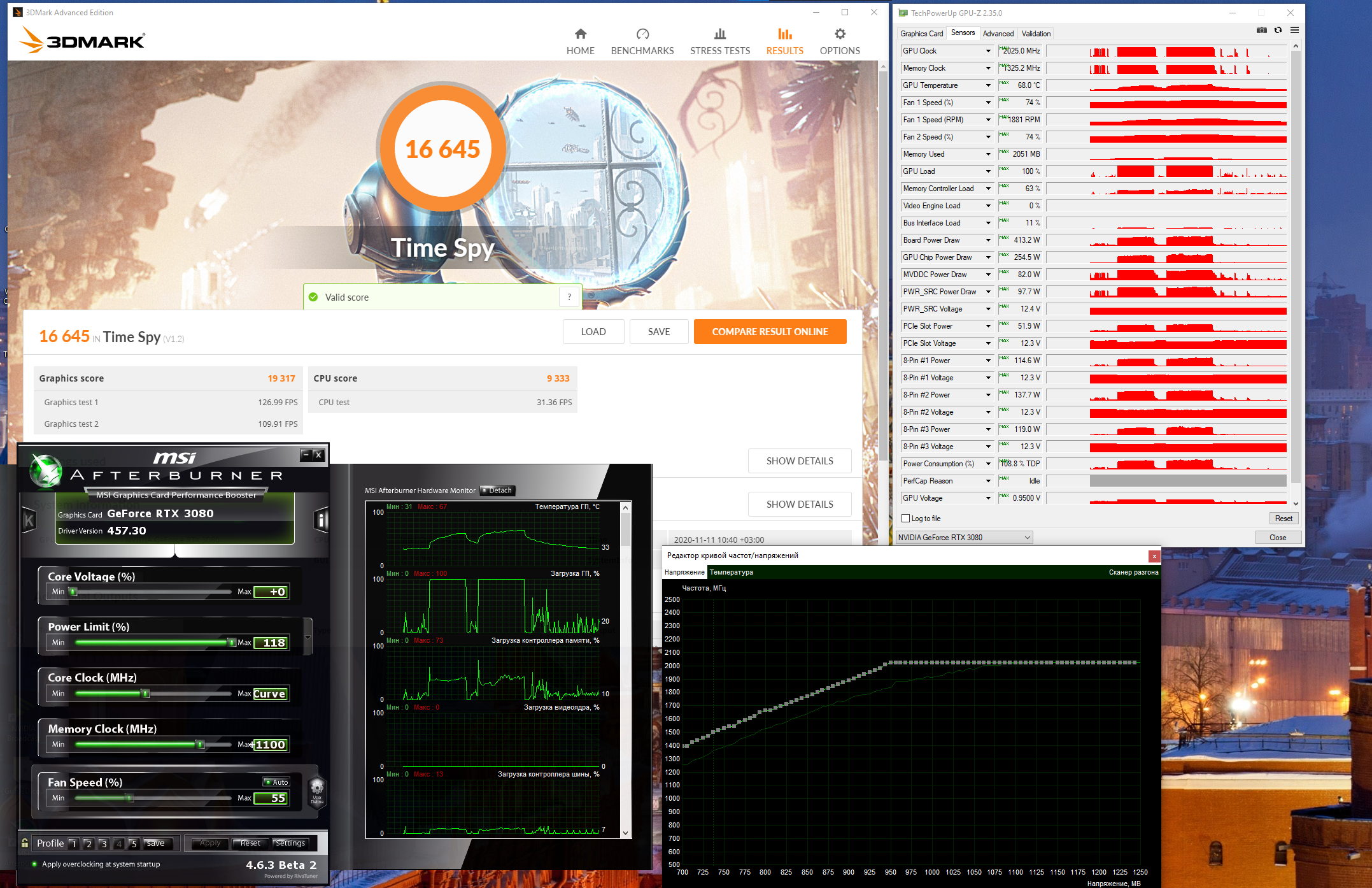 Спасибо за рекомендацию с курвой. Было время попрактиковаться с настройкой. Искал минимальное напряжение с максимальной частотой не менее 2025. Корпусные вентиляторы работают на минимальных оборотах, вентиляторы видеокарты в авто режиме. Видеокарта EVGA RTX 3080 FTW3 ULTRA. Результат в Time Spy: http://www.3dmark.com/3dm/52877476?logi ... z-CmLCk-ig Результат в Port Royal: http://www.3dmark.com/3dm/52877912?logi ... nrzyRxSbmA Во вложении скриншот с Time Spy и мониторами.