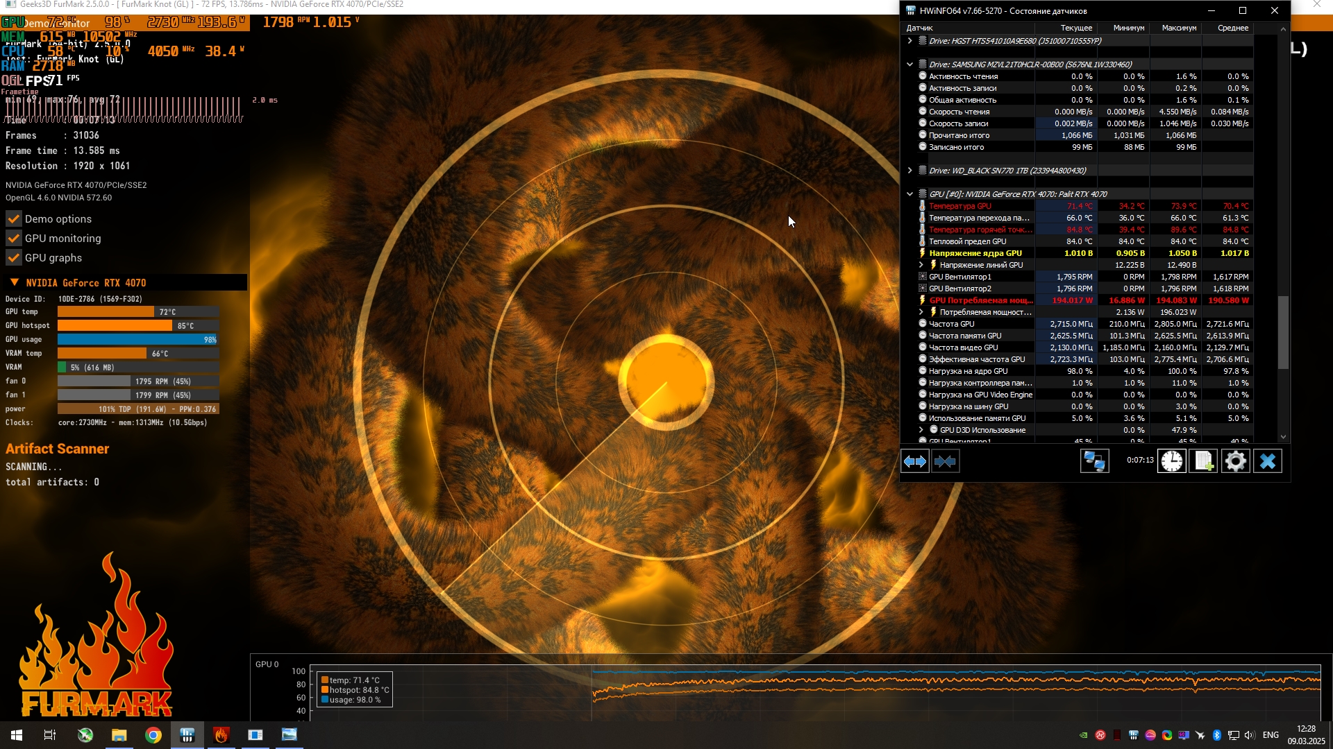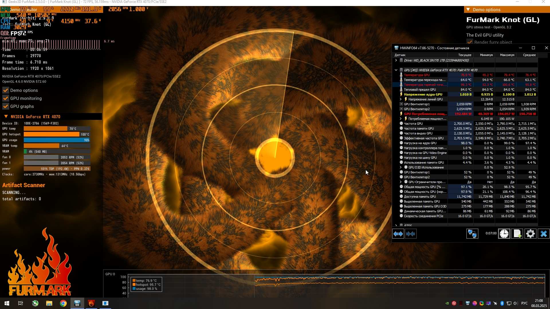 На тему замены родной термопасты видеокарты RTX 4070 palit dual os на фазовой переход (заменил неделю назад), карте где то 1.5 года. В стоке hot spot в fur mark (7 мин) доходил до 101 градусов, (в играх таких температур не было, но дельта была 20 градусов), в режиме 2730mhz \950v hot spot в том же furmark был 90.6гр. После замены же honeywell ptm7950 сразу провел те же тесты: в стоке Hot spot стал 91 и вентиляторы на 200 оборотов меньше, в 2730\950v - 83 градусов.