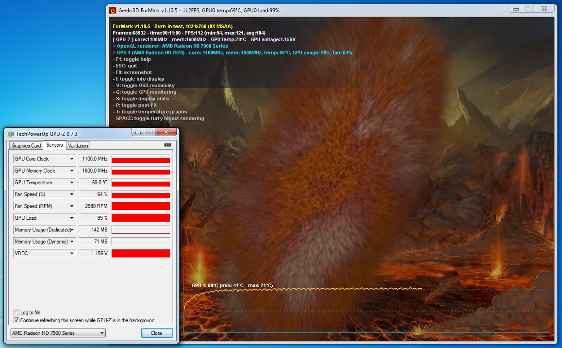 жарил профильную и получил такую же приблизительно температуру, но при 1.25, и крутилятор чуть меньше раскрутился, около 5% разницы мб дело в асике, у меня 61.9% прожарить в данный момент не могу, так как отдал мать по гарантии )) з.ы. был владельцем 7850 от силыцвета и там при 1100@1.2в грелась до 90 и шумела как самолёт, так что имхо всё ок с асусом ))