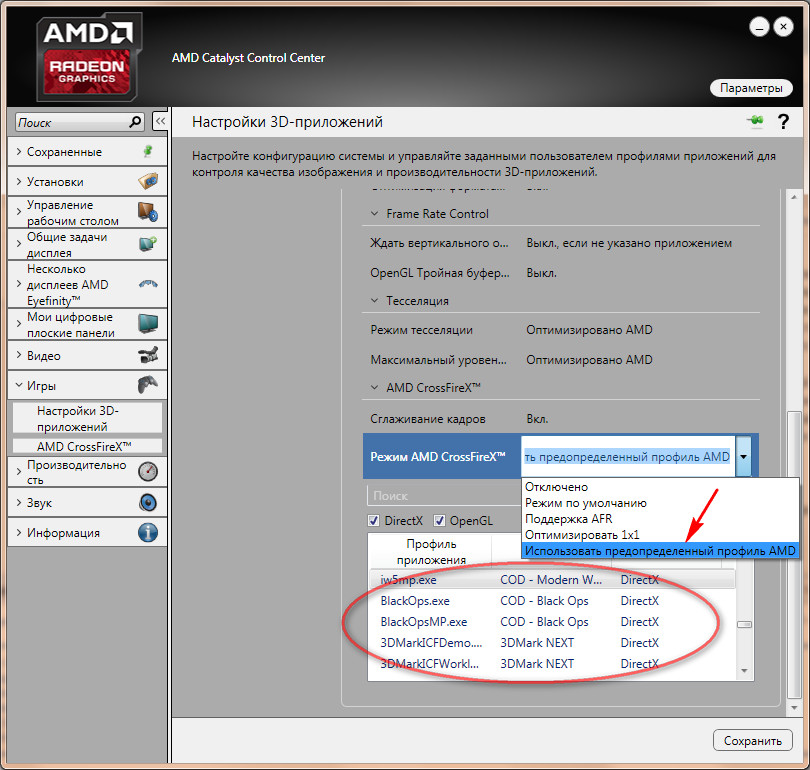 В Каталисте открываем вкладку "Игры" - "настройка 3D-приложений" -