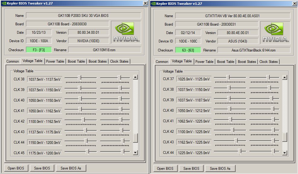 Сам отвечу. Видать "цепочка" или таблица напряжений у Titan Black как-то более удачно выстроена. Немного изменив напряжения после CLK37 смог увеличить буст-позицию до CLK45. Теперь карта сама бустит до 1306Мгц и при этом сама выставляет 1.200В. Раньше далее CLK37 карточка не бустила. Я еще расширил TDP до 285-300Вт. СВО может и больше тепла отвести, но стремно за "силовуху". У меня теперь: CLK45 1306Мгц - 1.2В CLK44 1293 - 1.200 CLK43 1280 - 1.175 CLK42 1267 - 1.162 CLK41 1254 - 1.150 Таблице напруг это теперь соответствует. Возможно свою буст позицию можно сдвинуть уменьшая напругу по цепочке в которой она будет стремиться к максимуму, но до этого желательно узнать разгонный потенциал карты. (слева - моя, справа Титан Влэк, тоже реф.)
